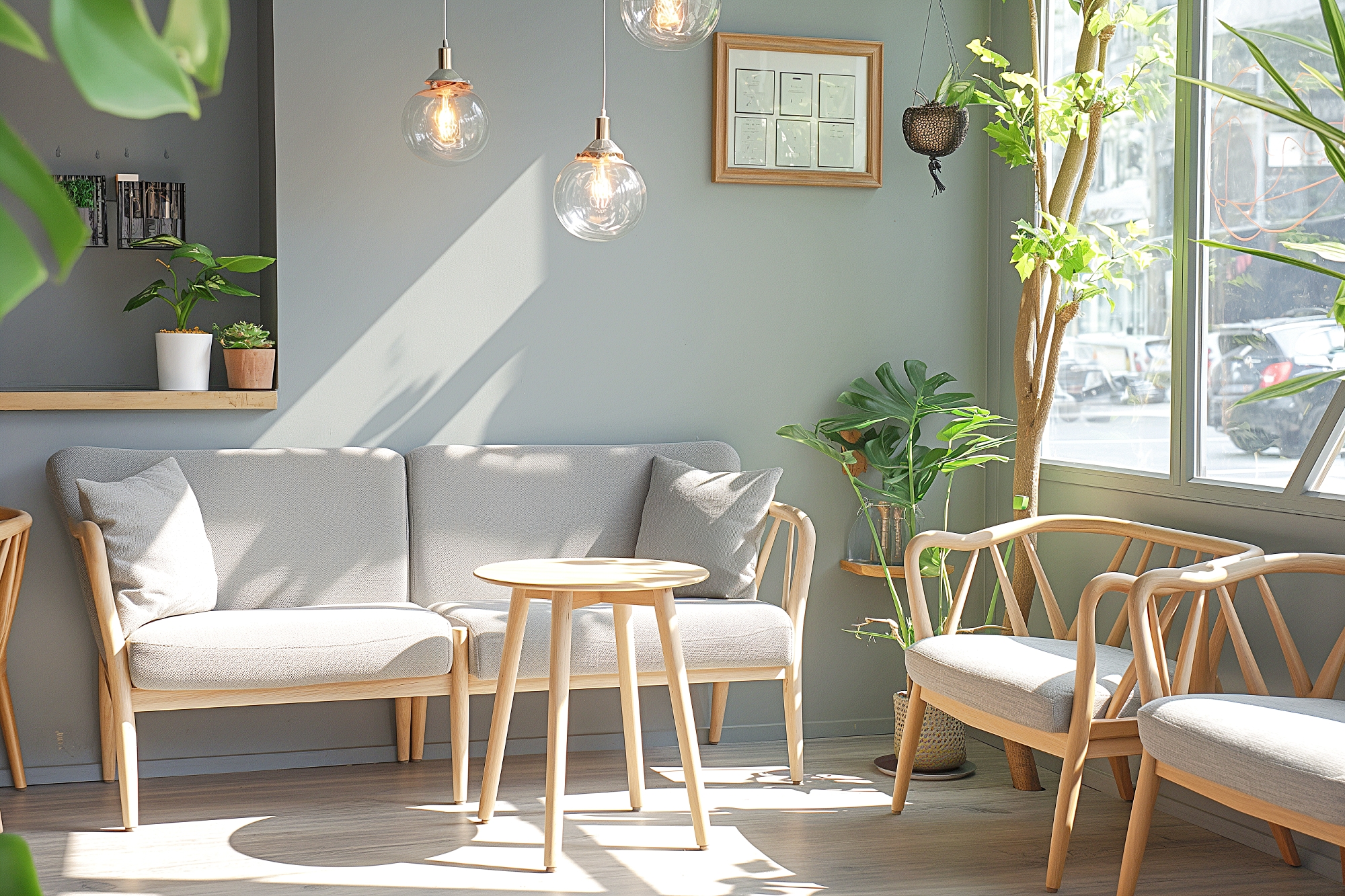 検索タグ:カフェ、インテリア、cafe、interior、店内、飲食店、オシャレ、お洒落、おしゃれ、フリー素材、フリー画像、AI生成画像、内装、内観、室内、店舗、お店、モダン、壁紙、ZOOM背景、配信用、背景素材、アイキャッチ、サムネイル、喫茶店、グレー、ソファ席、家具