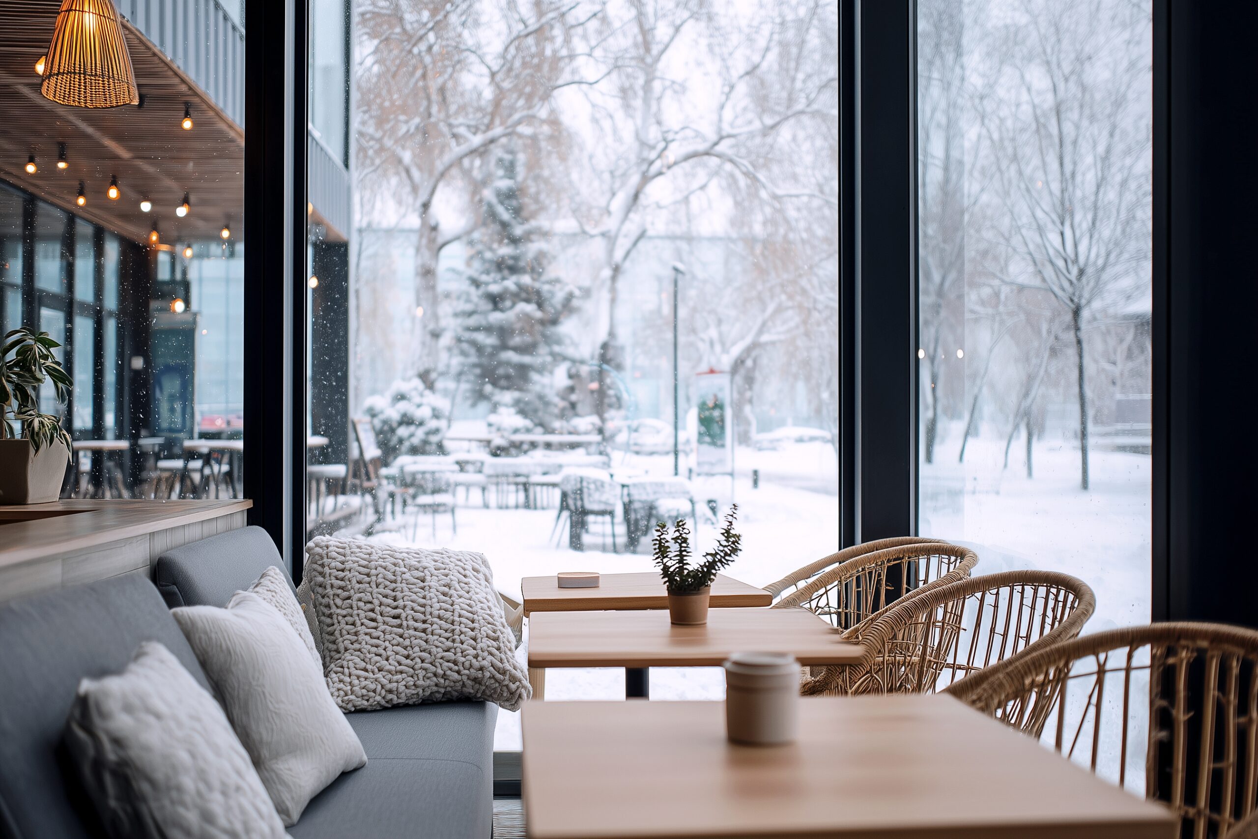 検索タグ:カフェ、cafe、飲食店、オシャレ、お洒落、おしゃれ、建物、建築、お店、店舗、フリー素材、フリー画像、AI生成画像、喫茶店、秋、Autumn、オータム、モダン、季節、free image、インテリア、innteria、内装、内観、背景素材、背景画像、Zoom背景、配信背景、冬、雪、寒い、季節、冬至、雪国、レトロ