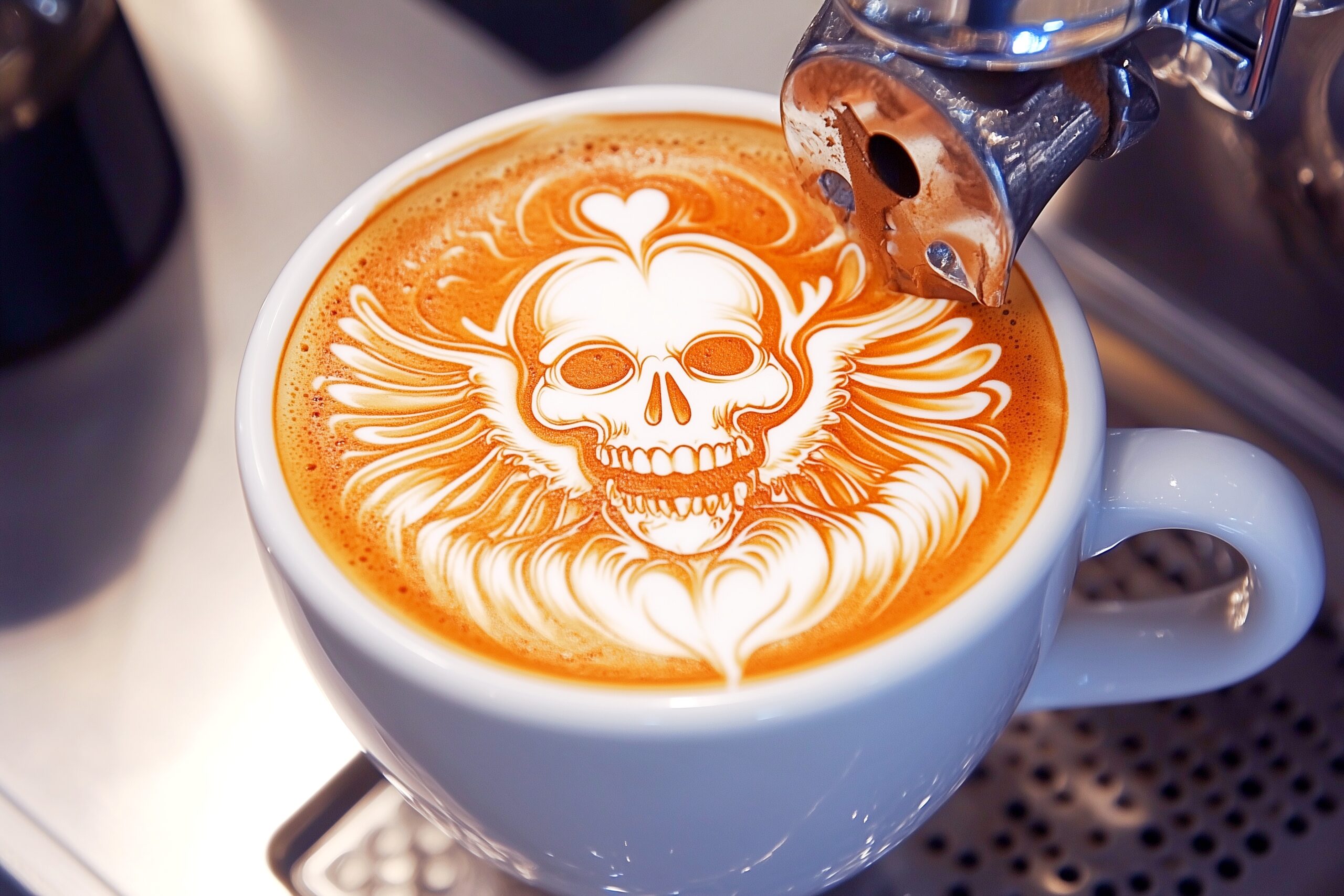 検索タグ:カフェ、インテリア、cafe、interior、店内、飲食店、オシャレ、お洒落、おしゃれ、木のテーブル、ホットコーヒー、ラテアート、フリー素材、フリー画像、AI生成画像、カフェラテ、モーニング、コピースペース、テキストスペース、無料画像、バリスタ、ドクロ、スカル、骸骨