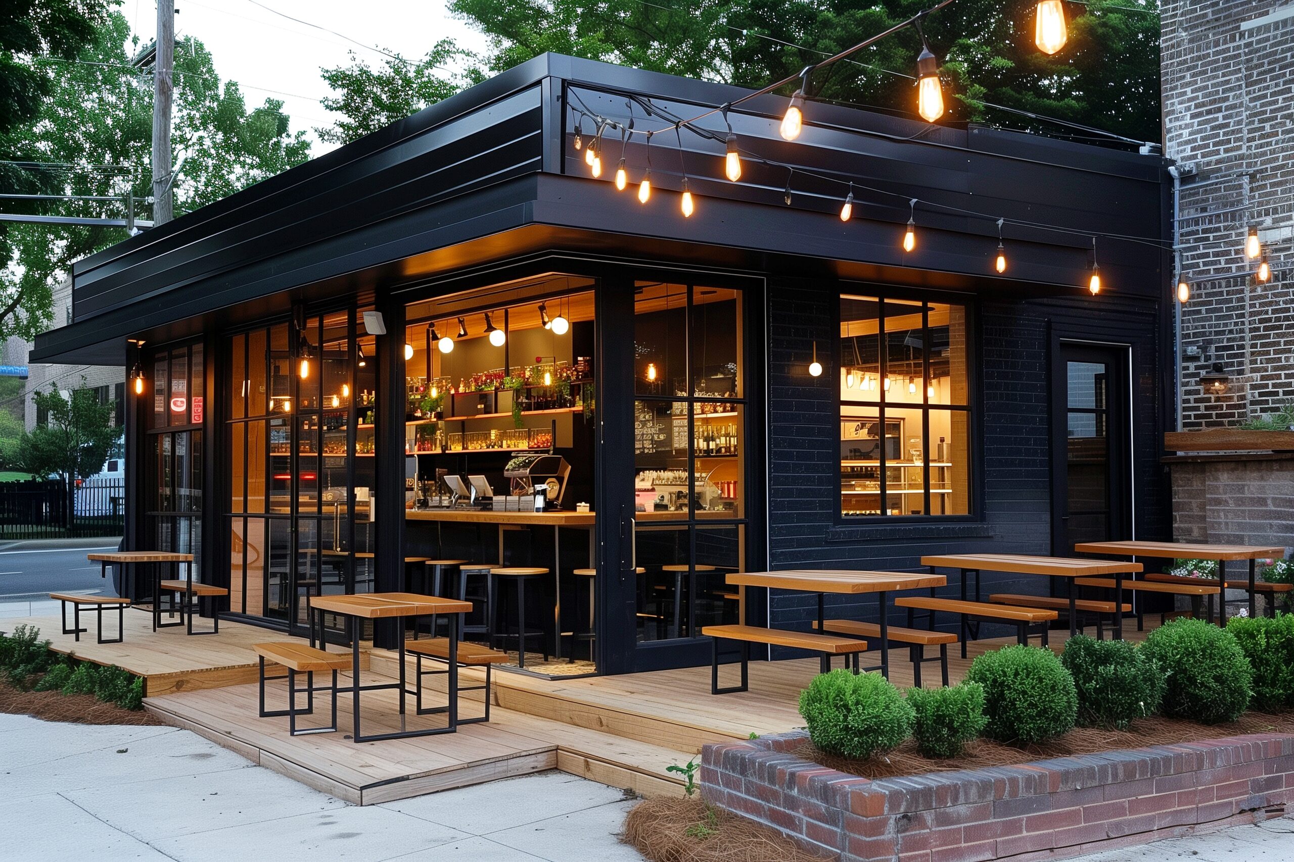 検索タグ:カフェ、cafe、飲食店、オシャレ、お洒落、おしゃれ、外観、建物、建築、お店、店舗、フリー素材、フリー画像、AI生成画像、黒、ブラック