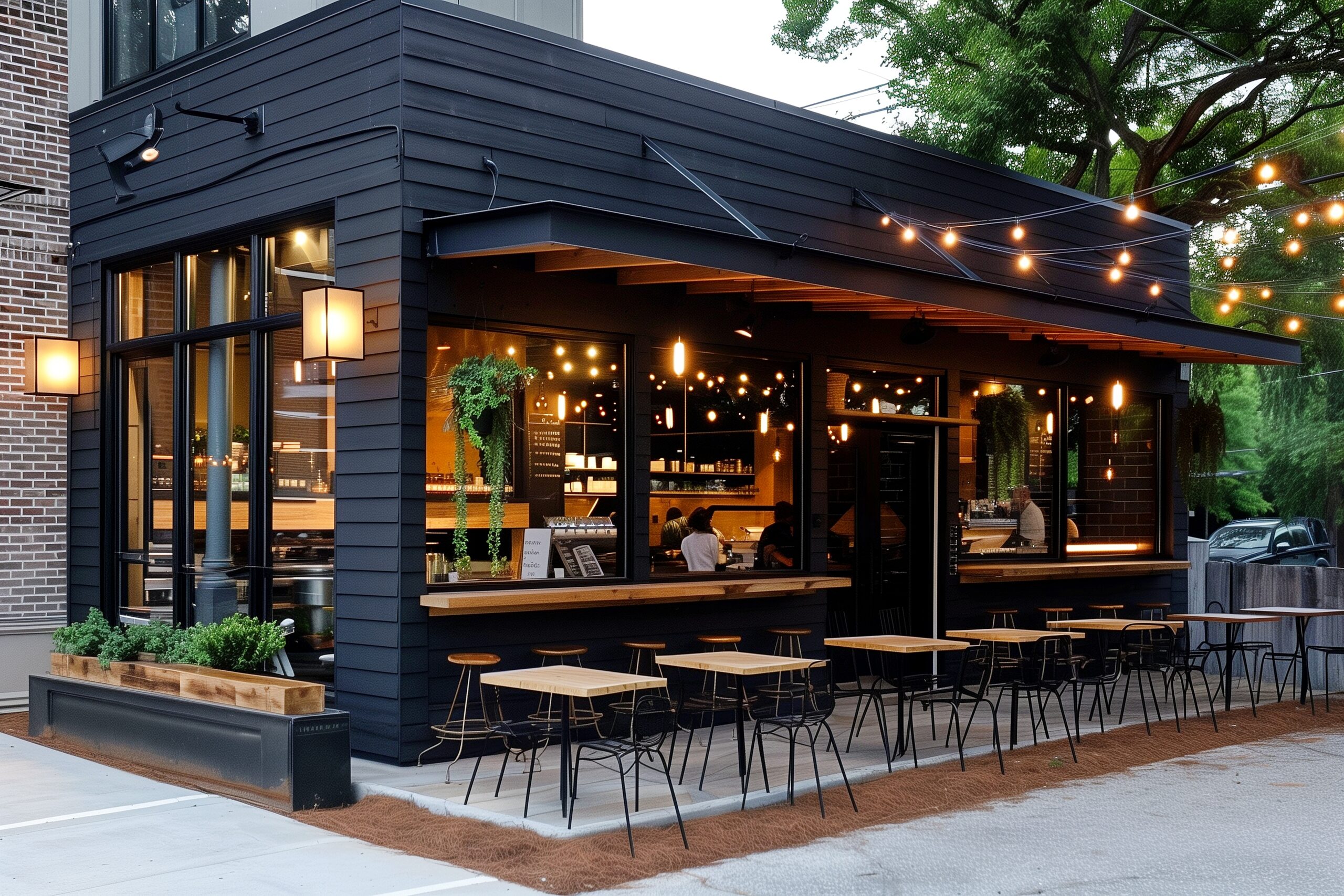 検索タグ:カフェ、cafe、飲食店、オシャレ、お洒落、おしゃれ、外観、建物、建築、お店、店舗、フリー素材、フリー画像、AI生成画像、黒、ブラック