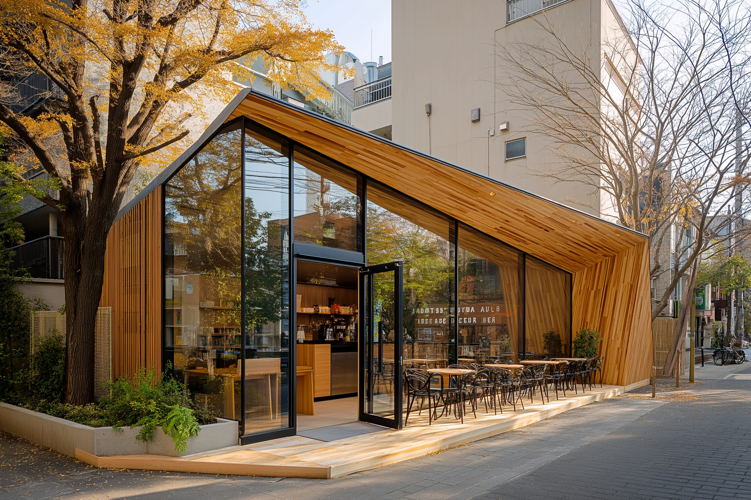 検索タグ:カフェ、cafe、飲食店、オシャレ、お洒落、おしゃれ、外観、建物、建築、お店、店舗、フリー素材、フリー画像、AI生成画像、外装、懐かしい雰囲気、喫茶店、秋、Autumn、オータム、モダン、季節、紅葉、季節、四季