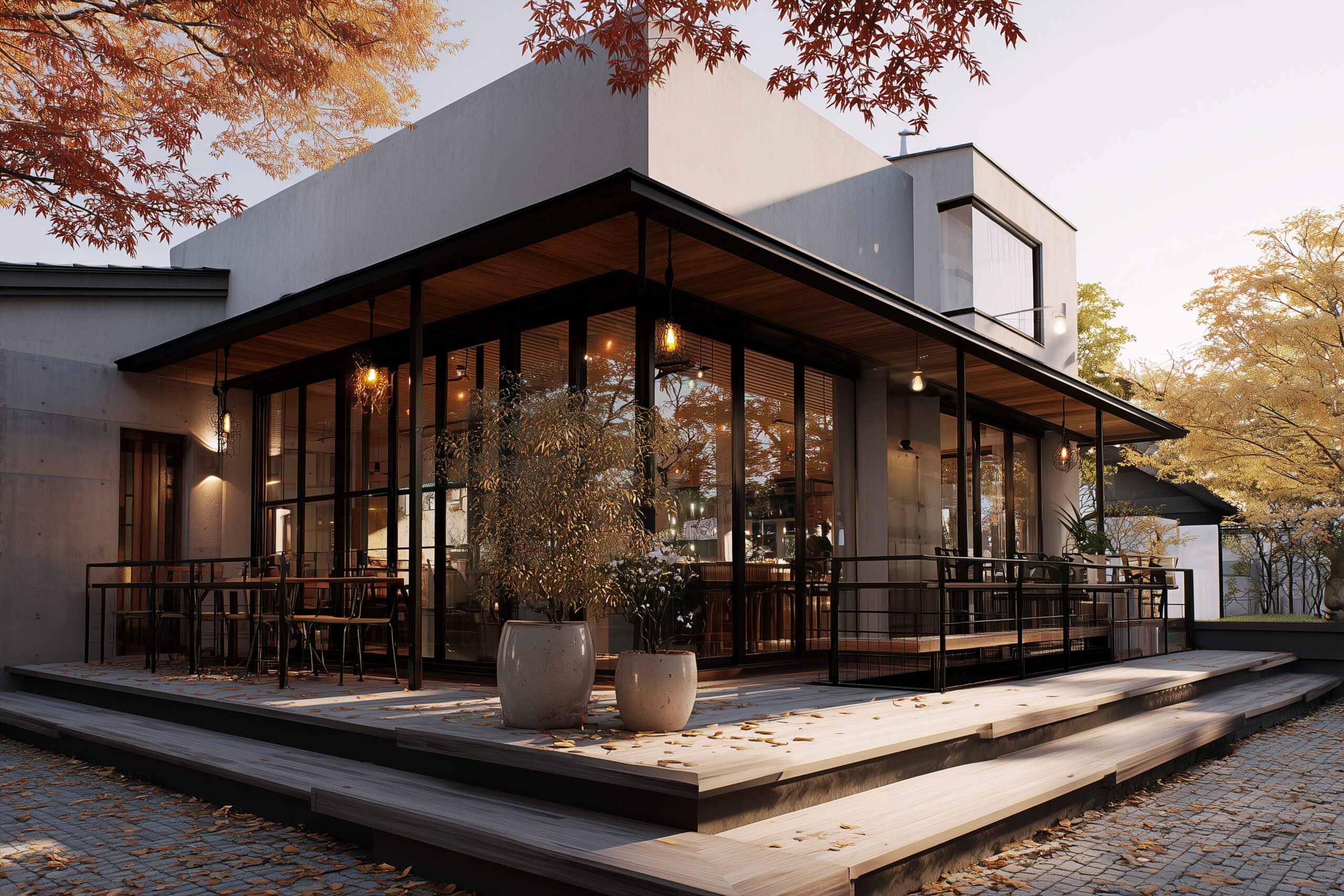 検索タグ:カフェ、cafe、飲食店、オシャレ、お洒落、おしゃれ、外観、建物、建築、お店、店舗、フリー素材、フリー画像、AI生成画像、外装、懐かしい雰囲気、喫茶店、秋、Autumn、オータム、モダン、季節、紅葉、季節、四季