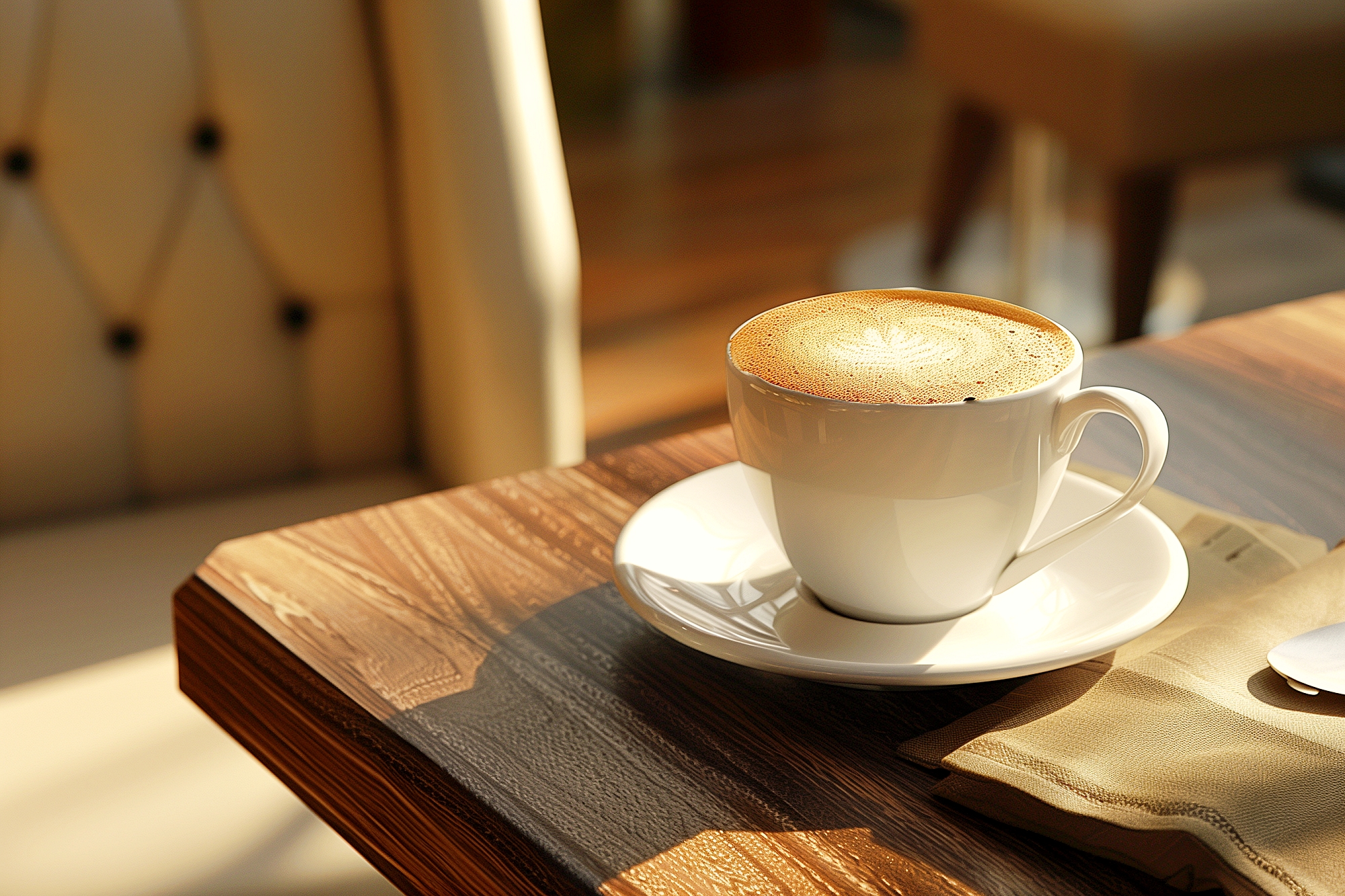 検索タグ:カフェ、インテリア、cafe、interior、店内、飲食店、オシャレ、お洒落、おしゃれ、木のテーブル、ホットコーヒー、フリー素材、フリー画像、AI生成画像、カフェラテ、モーニング、コピースペース、テキストスペース、背景、壁紙、珈琲、シンプル、カフェオレ、カプチーノ、泡、あわ、ラテアート
