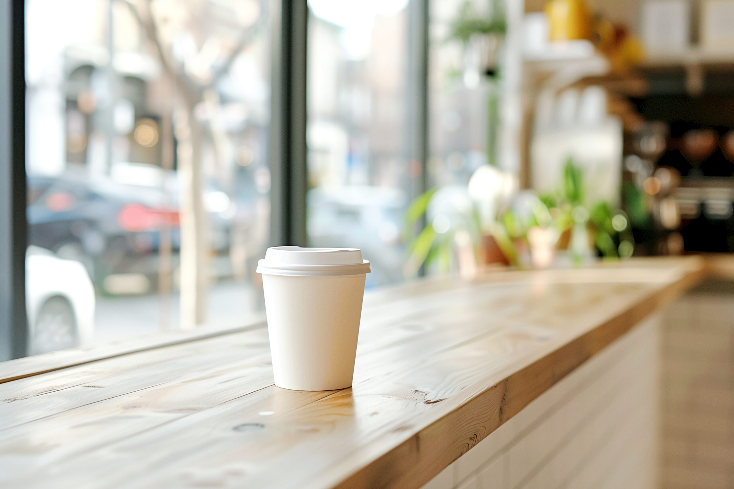 検索タグ:カフェ、インテリア、cafe、interior、店内、飲食店、オシャレ、お洒落、おしゃれ、木のテーブル、ホットコーヒー、フリー素材、フリー画像、AI生成画像、カフェラテ、モーニング、コピースペース、テキストスペース、テイクアウト、お持ち帰り、容器、入れもの、入れ物、アイスコーヒー、白、ホワイト