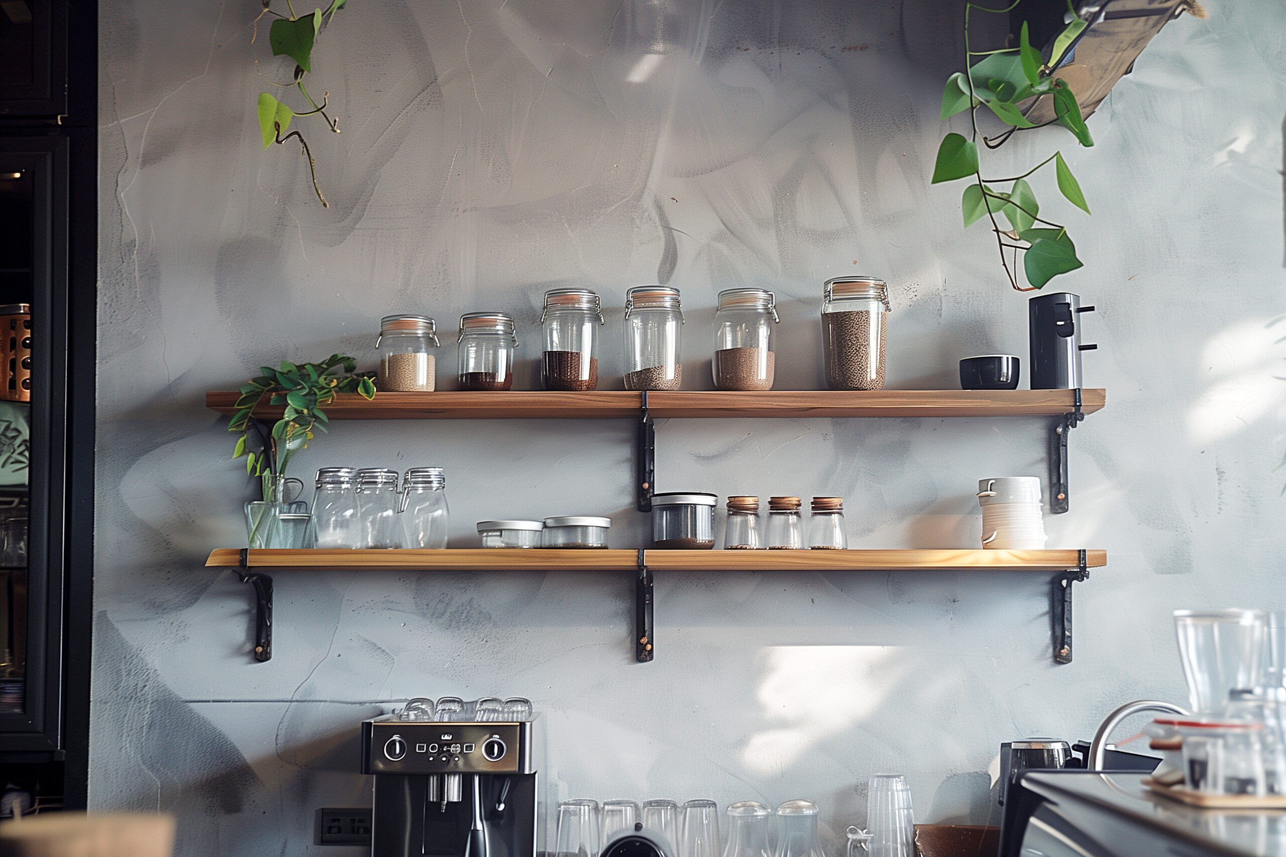 検索タグ:カフェ、インテリア、cafe、interior、店内、飲食店、オシャレ、お洒落、おしゃれ、フリー素材、フリー画像、AI生成画像、内装、内観、室内、店舗、お店、モダン、壁紙、ZOOM背景、配信用、背景素材、アイキャッチ、サムネイル、喫茶店、シェルフ、インテリア雑貨、棚、食器、瓶