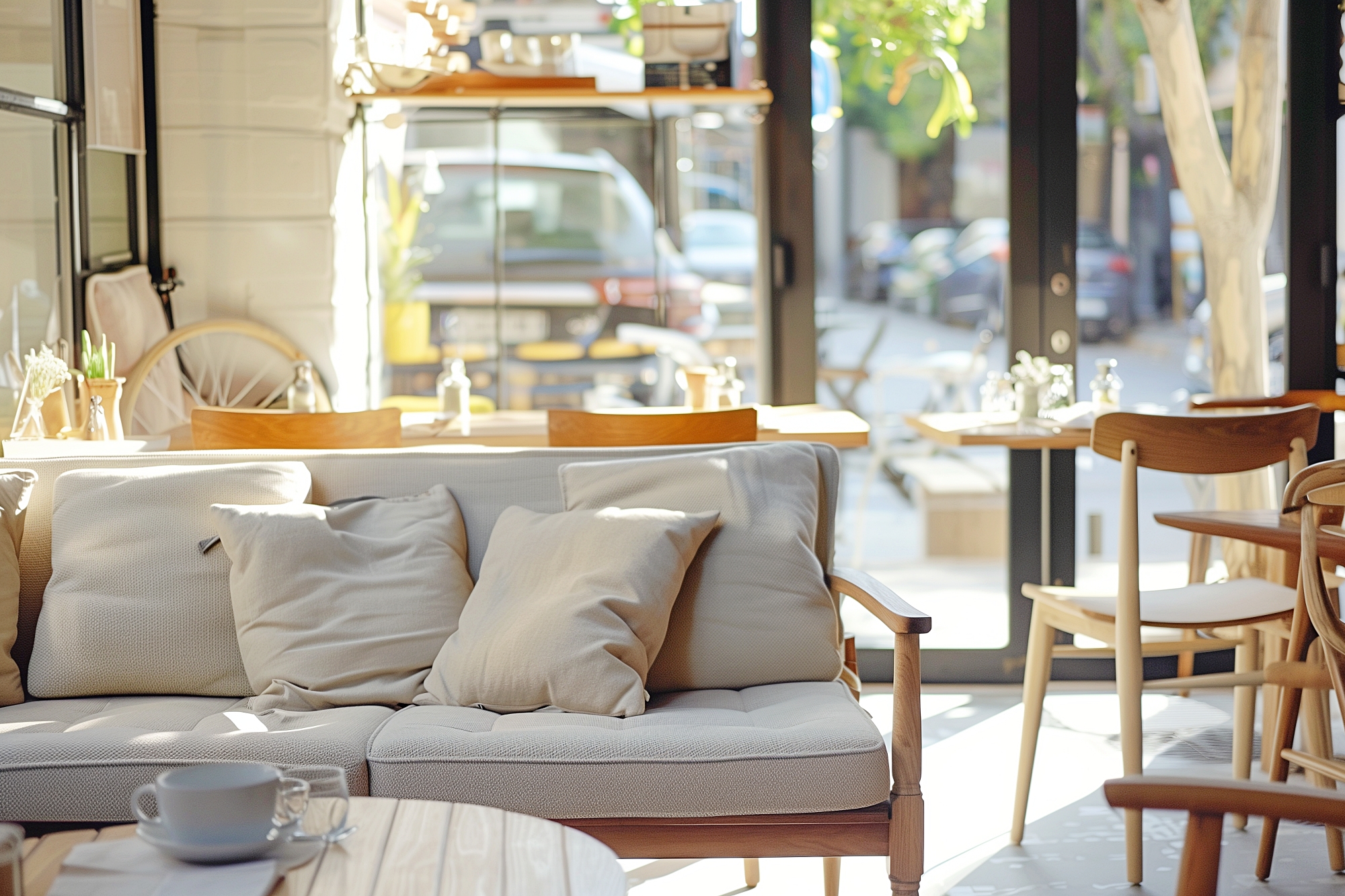 検索タグ:カフェ、インテリア、cafe、interior、店内、飲食店、オシャレ、お洒落、おしゃれ、フリー素材、フリー画像、AI生成画像、内装、内観、室内、店舗、お店、モダン、壁紙、ZOOM背景、配信用、背景素材、アイキャッチ、サムネイル、喫茶店、グレー、ソファ席