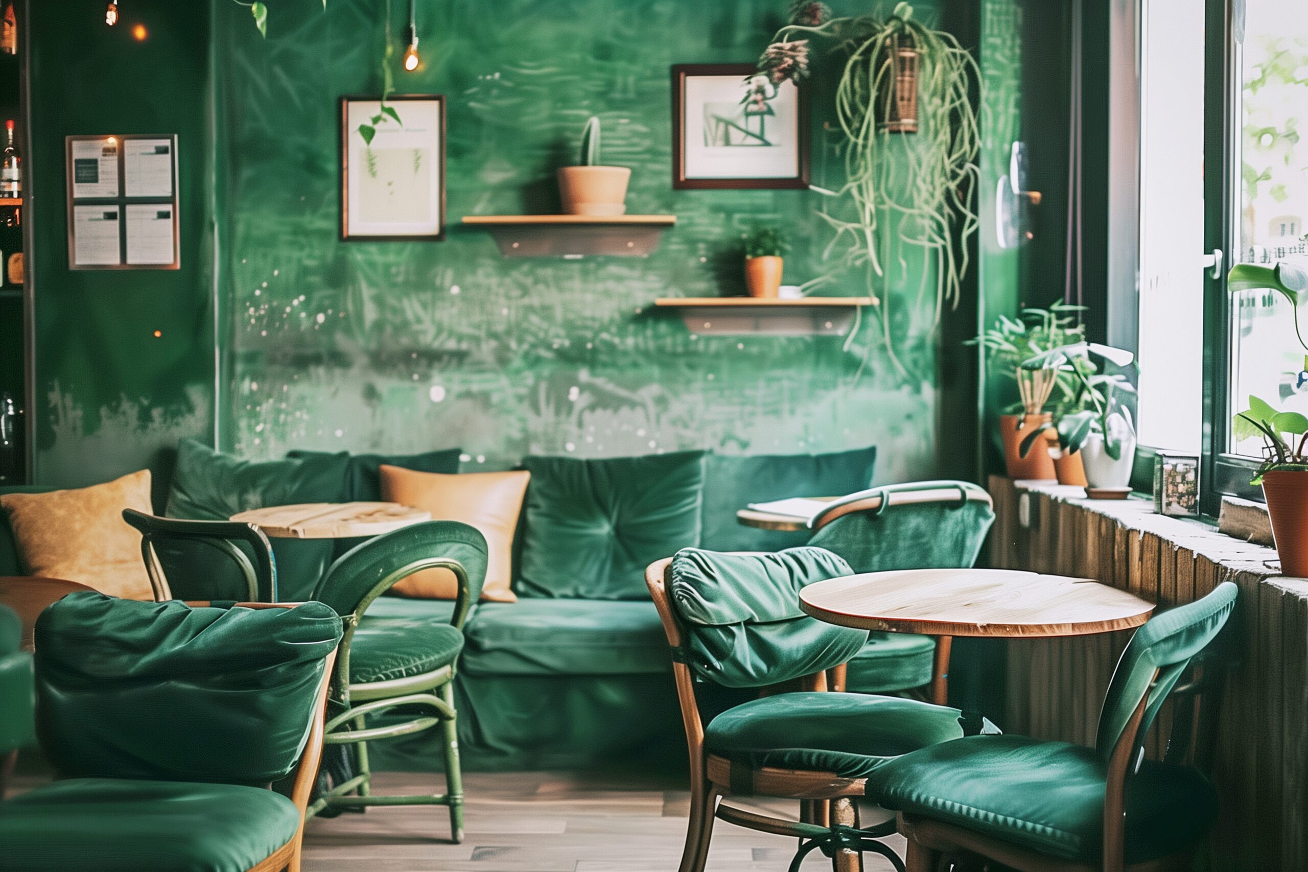 検索タグ:カフェ、インテリア、cafe、interior、店内、飲食店、オシャレ、お洒落、おしゃれ、明るい、ソファ席、テーブル、チェア、椅子、室内、屋内、内装、内観、フリー素材、フリー画像、ストックフォト、AI生成画像、緑、グリーン