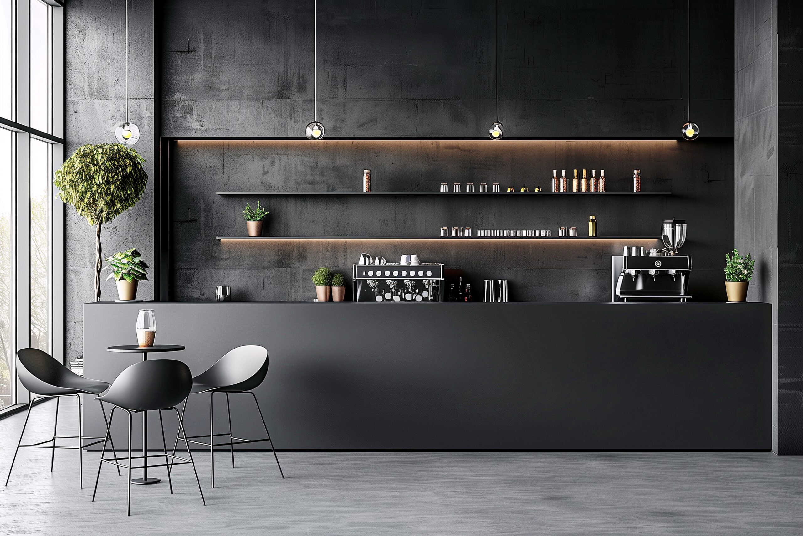 検索タグ:カフェ、インテリア、cafe、interior、店内、飲食店、オシャレ、お洒落、おしゃれ、ソファ席、室内、屋内、内装、内観、フリー素材、フリー画像、AI生成画像、ブラック、黒、高級感、テーブル席、カウンターテーブル、グレー、レストラン