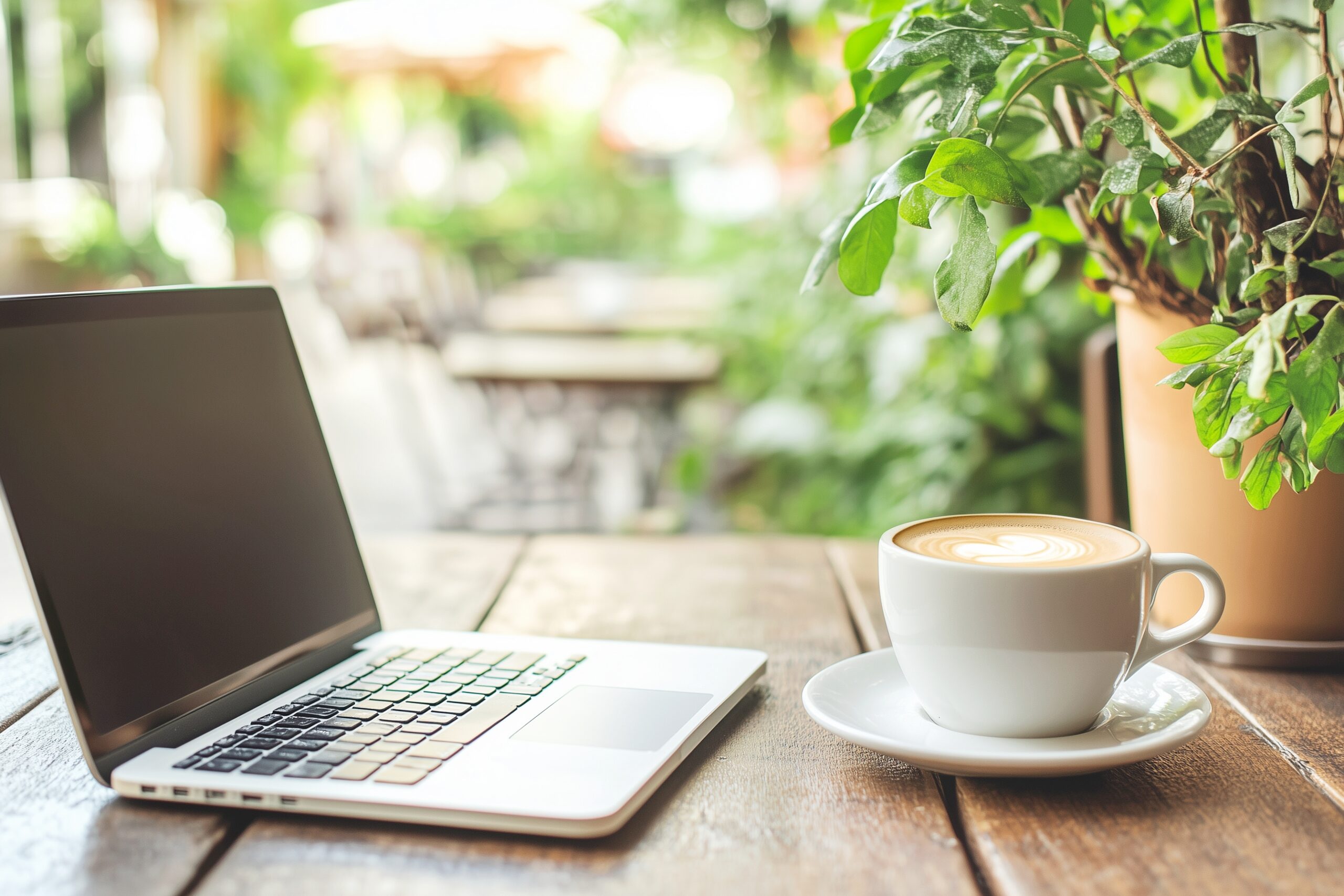 検索タグ:カフェ、インテリア、cafe、interior、店内、飲食店、オシャレ、お洒落、おしゃれ、木のテーブル、ホットコーヒー、フリー素材、フリー画像、AI生成画像、カフェラテ、モーニング、コピースペース、テキストスペース、ブラックコーヒー、背景、壁紙、珈琲、シンプル、カフェテラス、テラス、仕事、ノートパソコン、pc、フリーランス、デスクワーク