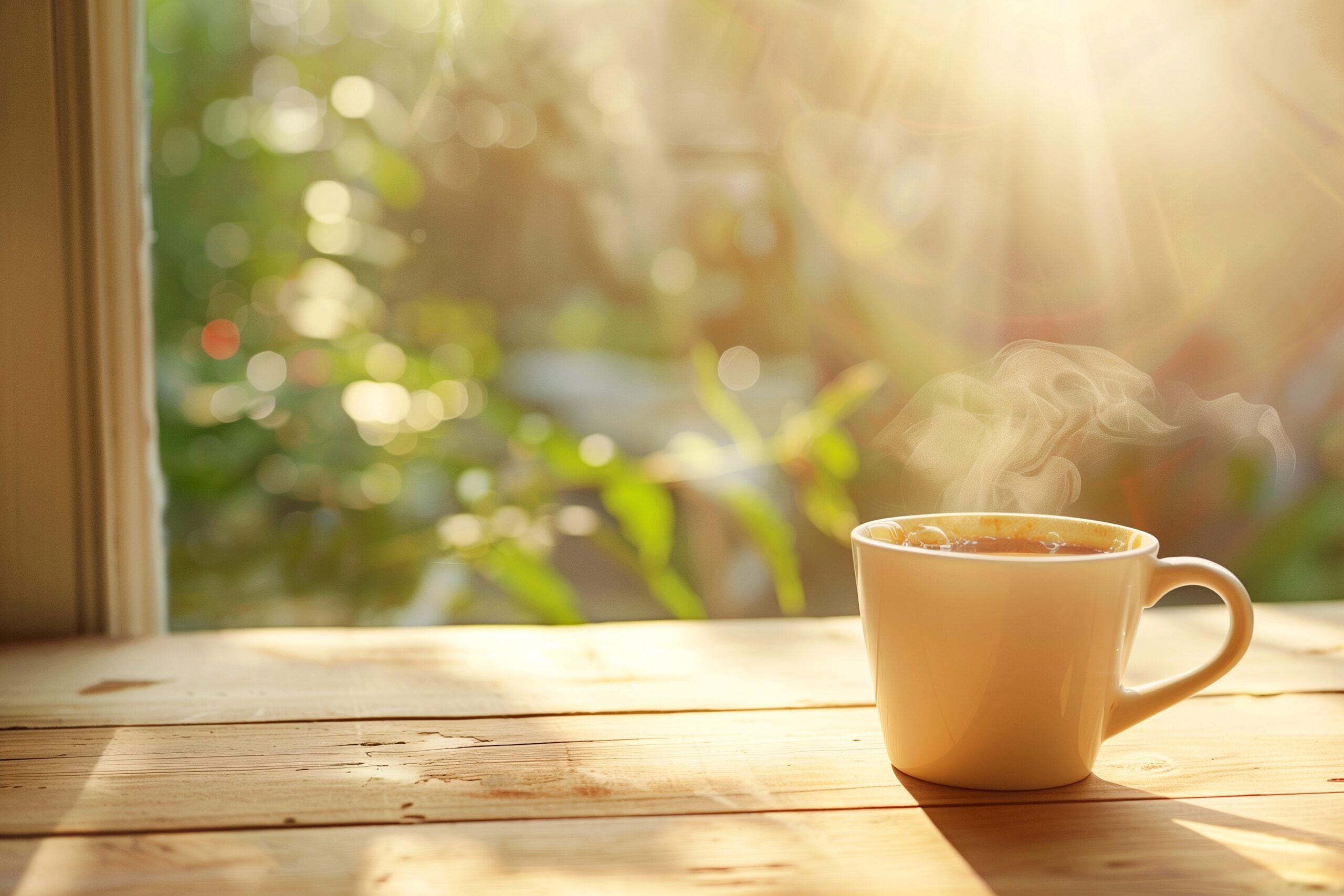 検索タグ:カフェ、インテリア、cafe、interior、店内、飲食店、オシャレ、お洒落、おしゃれ、木のテーブル、ホットコーヒー、ラテアート、フリー素材、フリー画像、AI生成画像、カフェラテ、日差し、太陽光、眩しい、光、モーニング、朝日、夕日