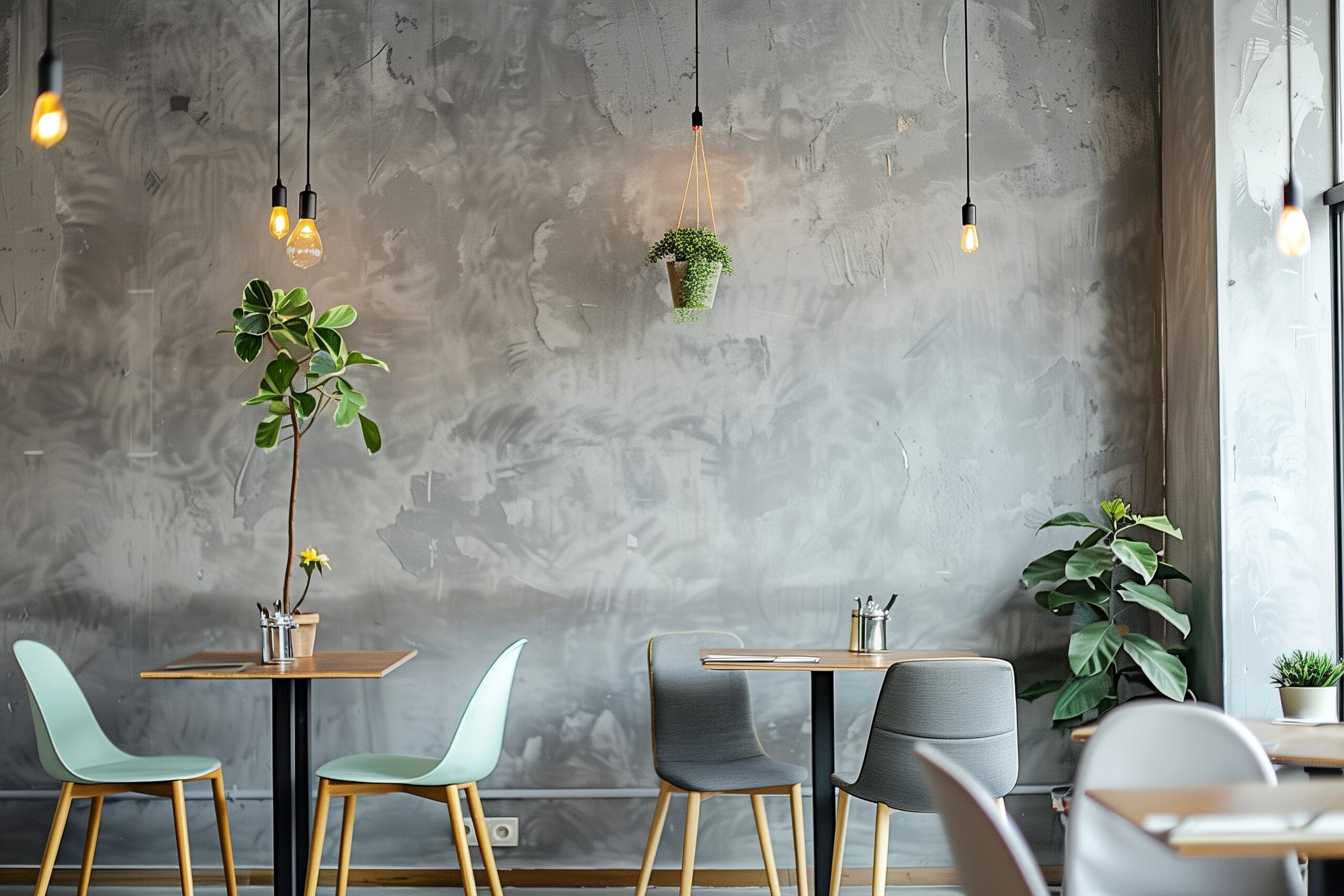 検索タグ:カフェ、インテリア、cafe、interior、店内、飲食店、オシャレ、お洒落、おしゃれ、室内、屋内、内装、内観、フリー素材、フリー画像、AI生成画像、木のテーブル、シンプル、コピースペース、モダン、グレー、灰色、シック、落ち着いた雰囲気