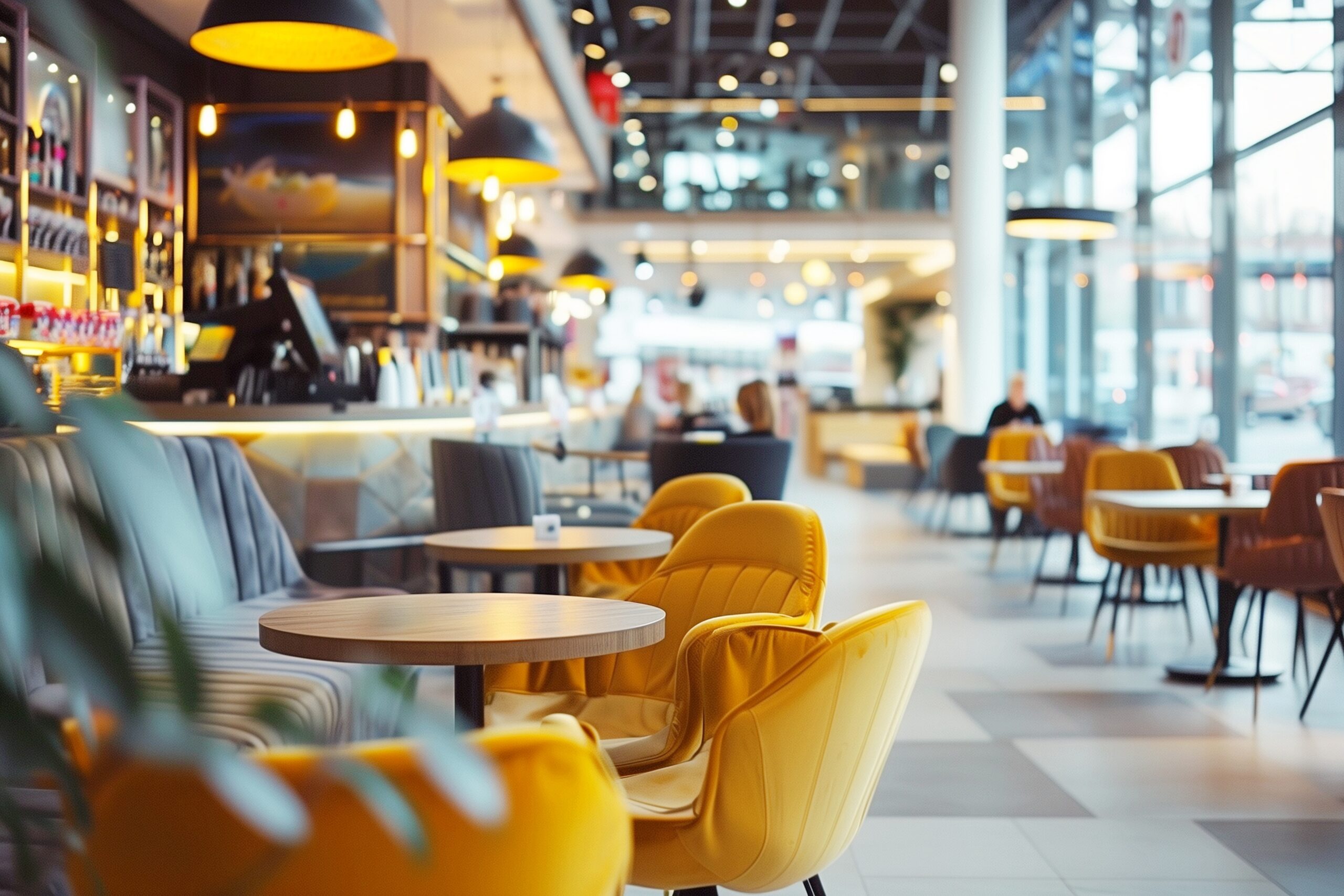 検索タグ:カフェ、インテリア、cafe、interior、店内、飲食店、オシャレ、お洒落、おしゃれ、室内、屋内、内装、内観、フリー素材、フリー画像、AI生成画像、木のテーブル、シンプル、コピースペース、広告、イメージ素材、カフェスペース、フードコート、ショッピングモール、机、椅子、イス