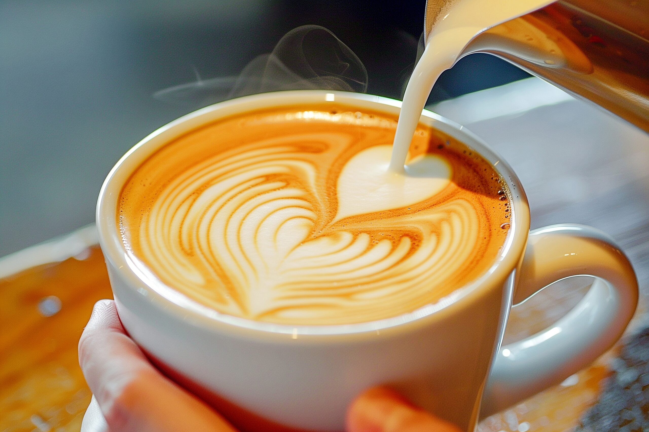 検索タグ:カフェ、インテリア、cafe、interior、店内、飲食店、オシャレ、お洒落、おしゃれ、木のテーブル、ホットコーヒー、ラテアート、フリー素材、フリー画像、AI生成画像、カフェラテ、モーニング、コピースペース、テキストスペース、無料画像、バリスタ、ハート