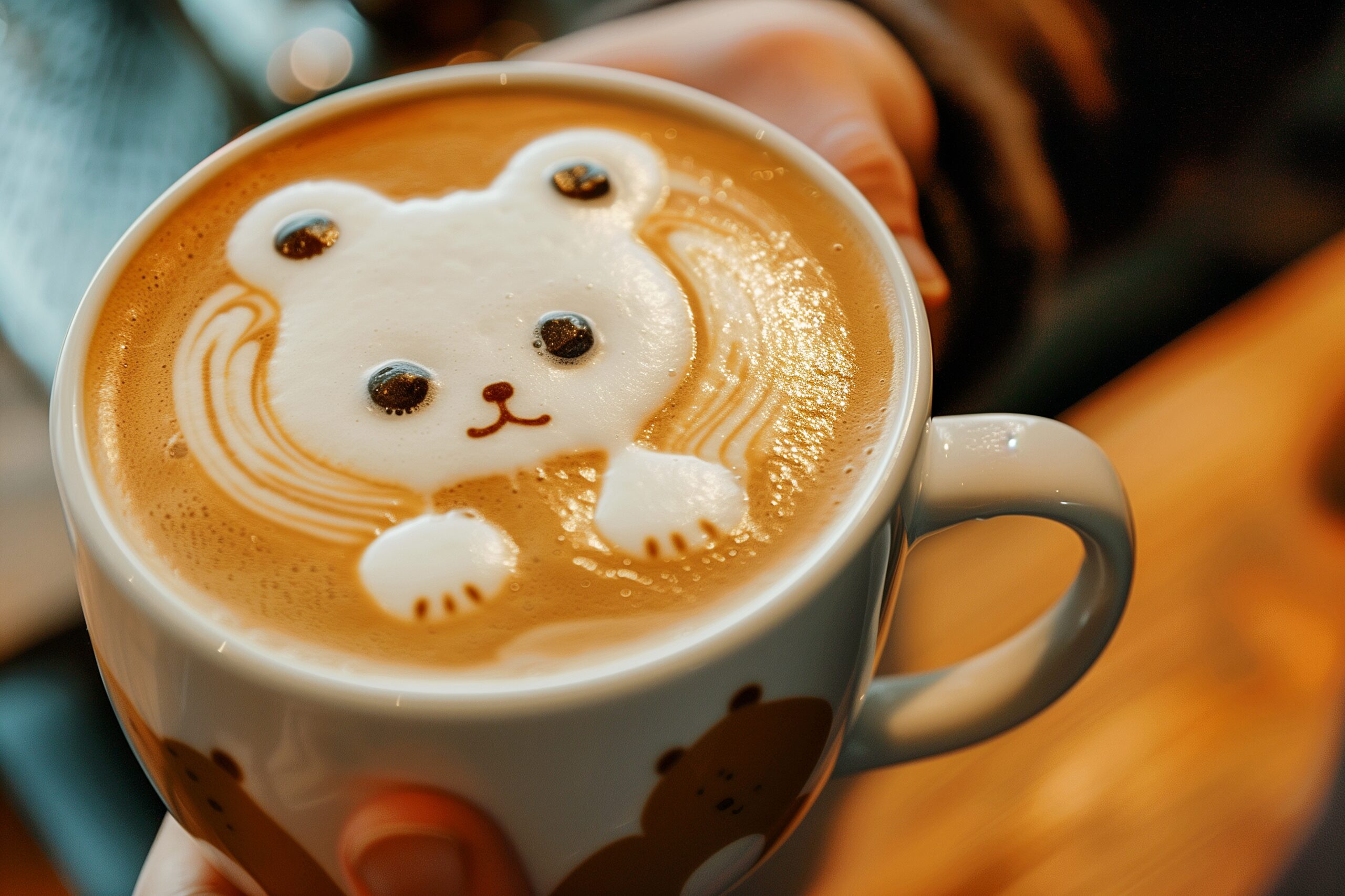 検索タグ:カフェ、インテリア、cafe、interior、店内、飲食店、オシャレ、お洒落、おしゃれ、木のテーブル、ホットコーヒー、ラテアート、フリー素材、フリー画像、AI生成画像、カフェラテ、モーニング、コピースペース、テキストスペース、無料画像、バリスタ、くま、クマ、熊、可愛い、かわいい