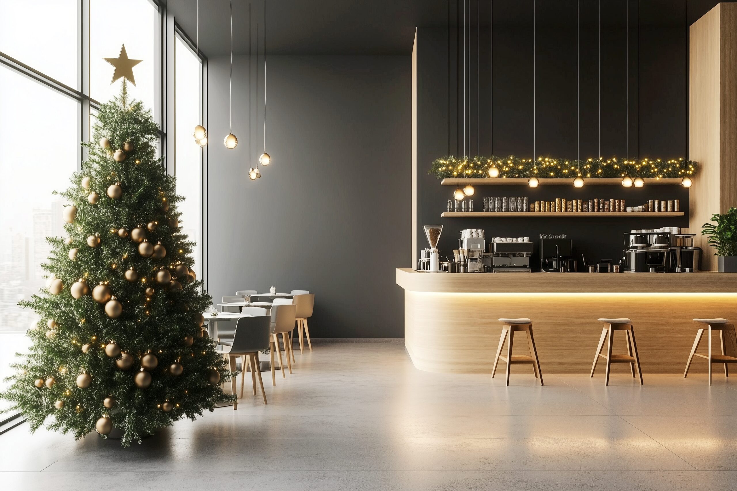 検索タグ:カフェ、インテリア、cafe、interior、店内、飲食店、オシャレ、お洒落、おしゃれ、フリー素材、フリー画像、、free、image、materials、AI生成画像、内装、内観、室内、店舗、お店、モダン、壁紙、ZOOM背景、配信用、背景素材、アイキャッチ、サムネイル、クリスマス、クリスマスイブ、クリスマスツリー、Christmas