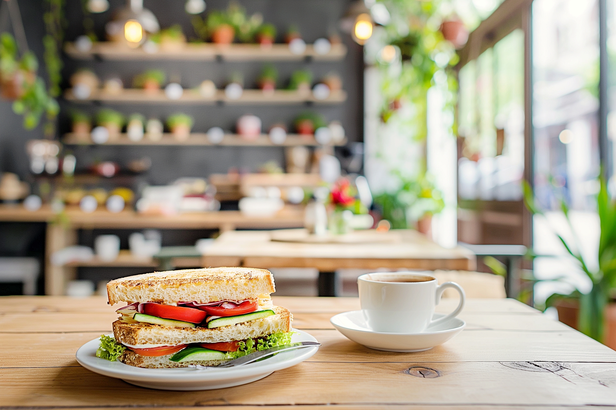 検索タグ:カフェ、cafe、店内、飲食店、オシャレ、お洒落、おしゃれ、テーブル、フリー素材、フリー画像、AI生成画像、ランチ、お昼ごはん、昼ご飯、食べ物、食事、フード、喫茶店、メニュー、サンドウィッチ、モーニング、朝食、朝ごはん、朝ご飯、グルメ