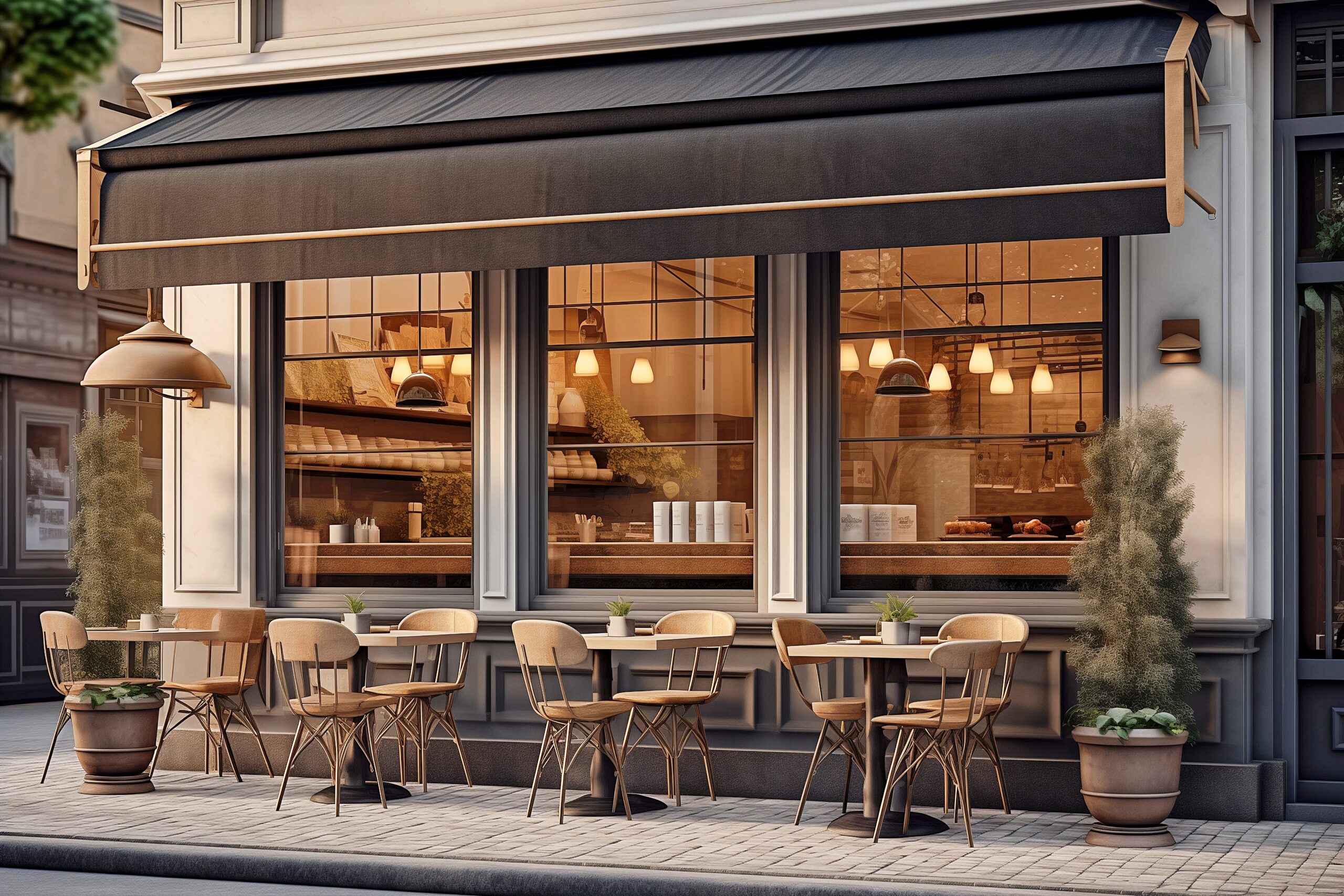 検索タグ:カフェ、cafe、飲食店、オシャレ、お洒落、おしゃれ、外観、建物、建築、お店、店舗、フリー素材、フリー画像、AI生成画像、レトロ感、海外、ヨーロッパ風、テラス席、小さなカフェ、デザイン、画像、外装、無料画像、前景、カフェショップフロント、テラス、夜