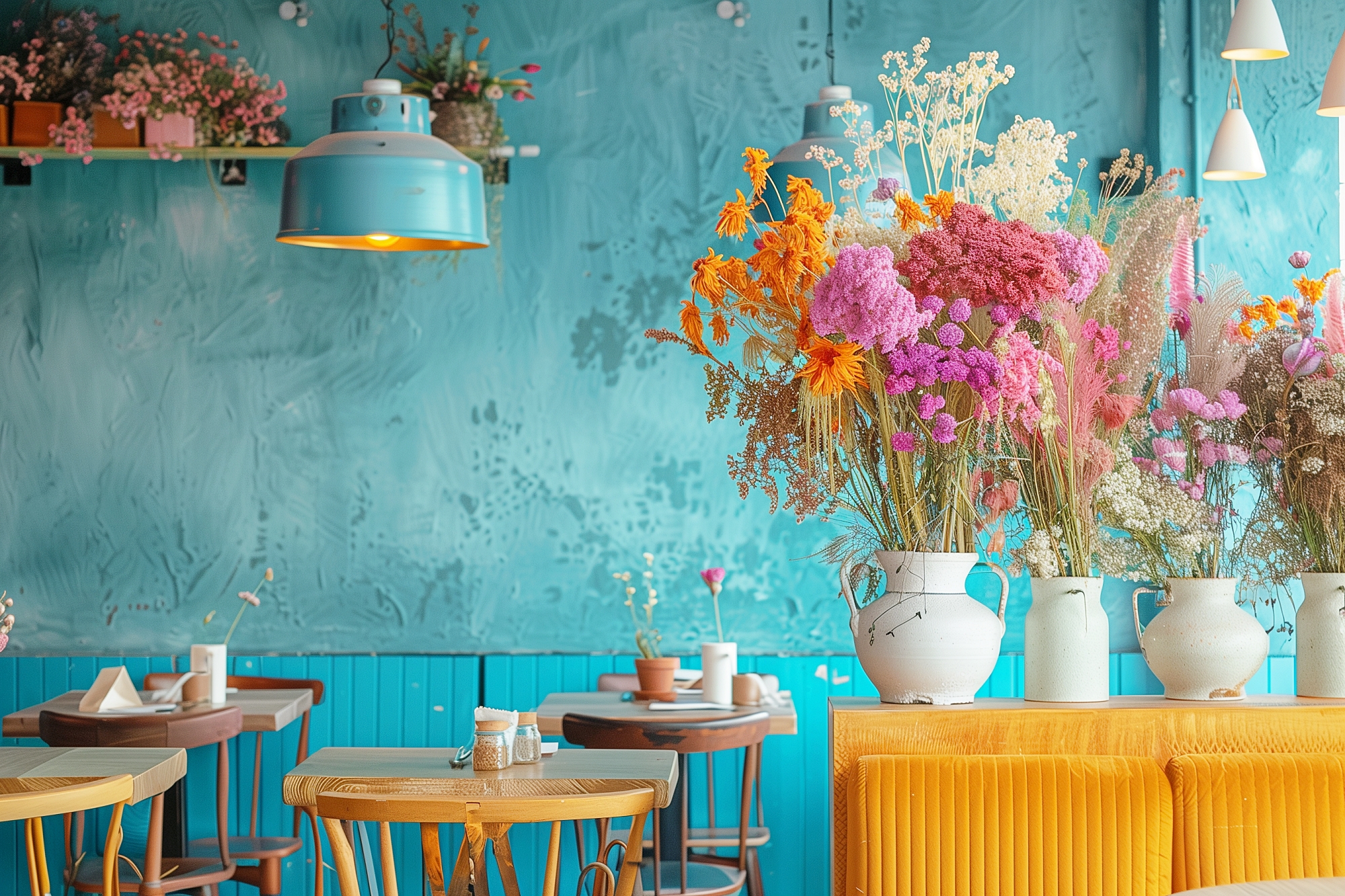検索タグ:カフェ、インテリア、cafe、interior、店内、飲食店、オシャレ、お洒落、おしゃれ、フリー素材、フリー画像、AI生成画像、内装、内観、室内、店舗、お店、モダン、壁紙、ZOOM背景、配信用、背景素材、アイキャッチ、サムネイル、喫茶店、ドライフラワー、お花、花