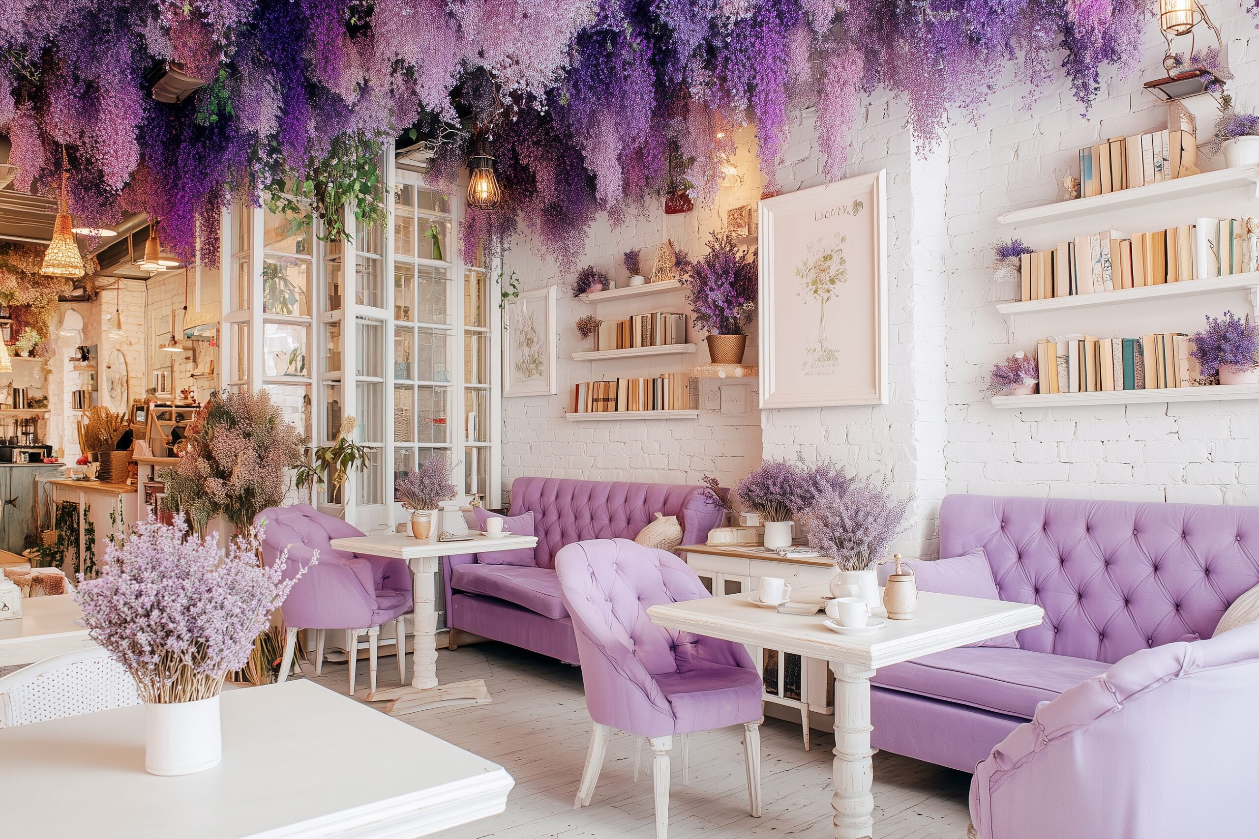 検索タグ:カフェ、インテリア、cafe、interior、店内、飲食店、オシャレ、お洒落、おしゃれ、フリー素材、フリー画像、AI生成画像、コピースペース、テキストスペース、無料画像、カフェテーブル、カフェタイム、table、テーブル席、インテリア、室内、内装、内観、free image、ラベンダー、ドライフラワー、lavender、dryflower、花、紫、パープル、purple