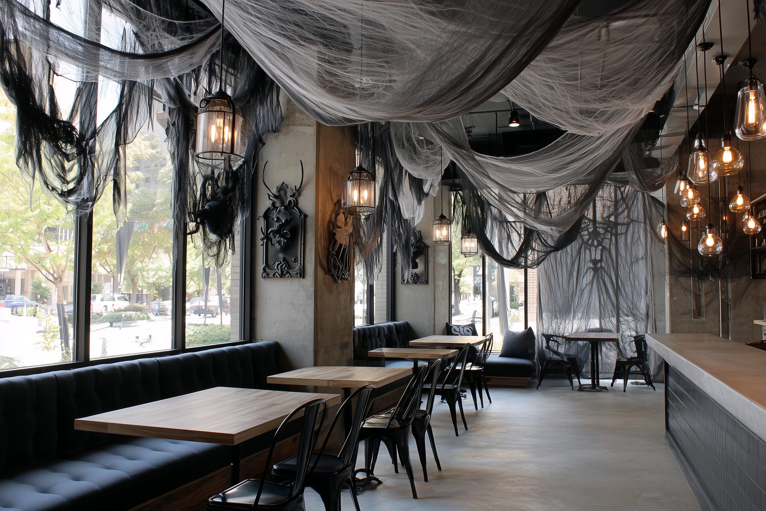 検索タグ:カフェ、cafe、飲食店、オシャレ、お洒落、おしゃれ、建物、建築、お店、店舗、フリー素材、フリー画像、AI生成画像、喫茶店、秋、Autumn、オータム、モダン、季節、free image、インテリア、innteria、内装、内観、ハロウィン、イベント、装飾、10月、10月31日、ハロウィーン、Halloween