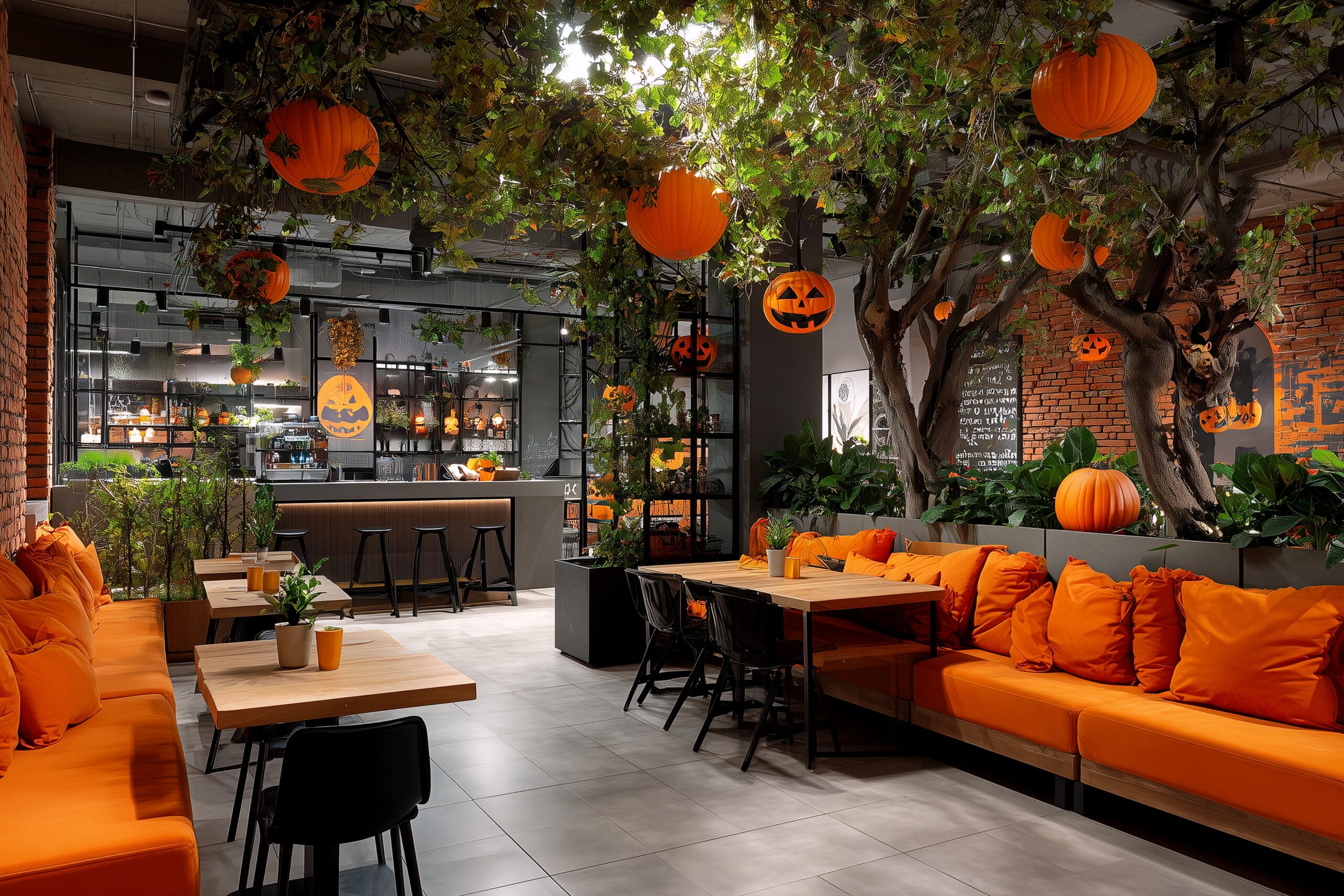 検索タグ:カフェ、cafe、飲食店、オシャレ、お洒落、おしゃれ、建物、建築、お店、店舗、フリー素材、フリー画像、AI生成画像、喫茶店、秋、Autumn、オータム、モダン、季節、free image、インテリア、innteria、内装、内観、ハロウィン、イベント、装飾、10月、10月31日、ハロウィーン、Halloween