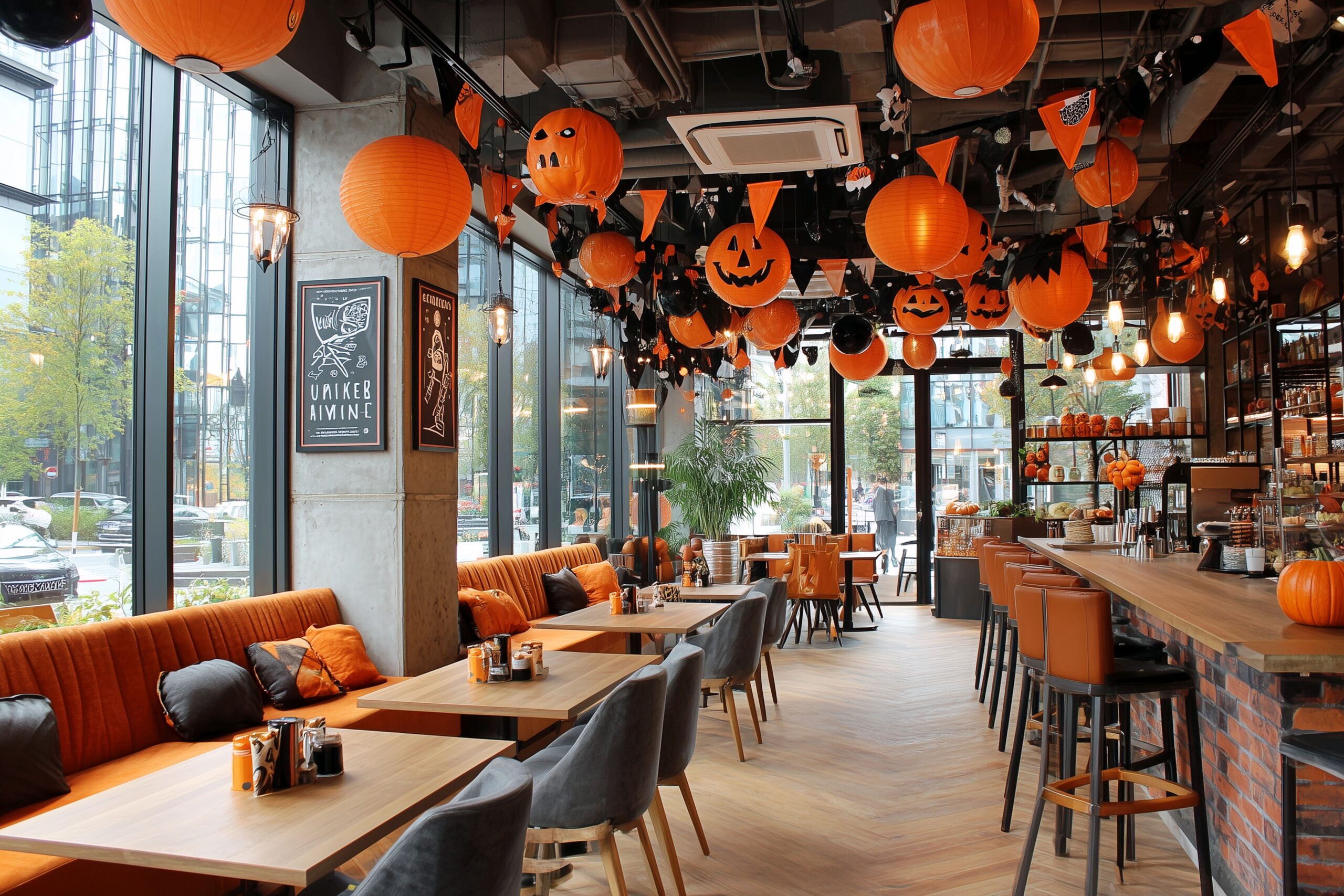 検索タグ:カフェ、cafe、飲食店、オシャレ、お洒落、おしゃれ、建物、建築、お店、店舗、フリー素材、フリー画像、AI生成画像、喫茶店、秋、Autumn、オータム、モダン、季節、free image、インテリア、innteria、内装、内観、ハロウィン、イベント、装飾、10月、10月31日、ハロウィーン、Halloween