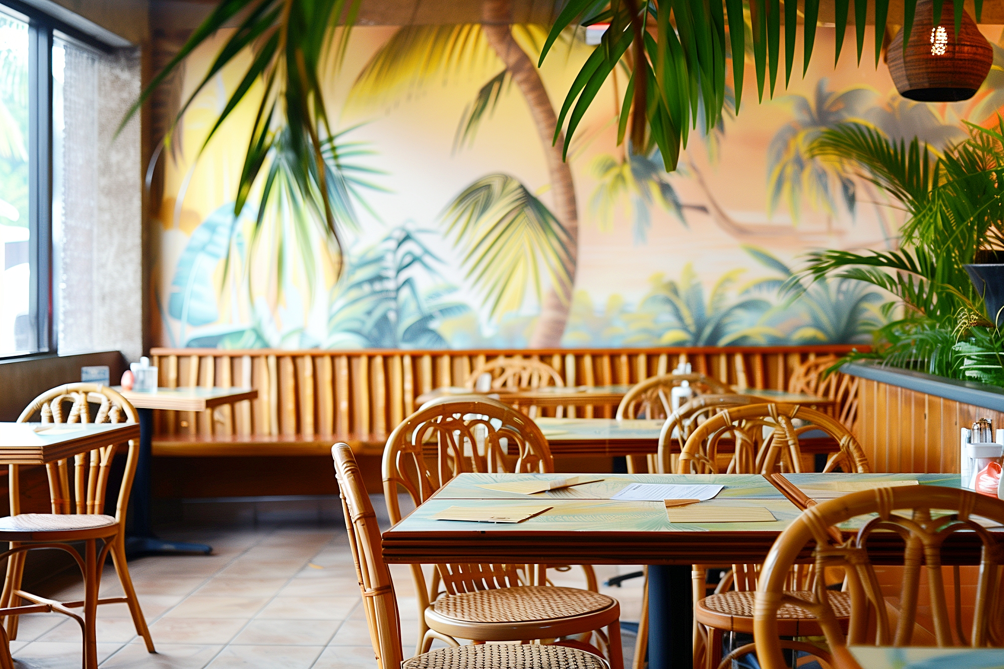 検索タグ:カフェ、インテリア、cafe、interior、店内、飲食店、オシャレ、お洒落、おしゃれ、フリー素材、フリー画像、AI生成画像、内装、内観、室内、店舗、お店、モダン、壁紙、ZOOM背景、配信用、背景素材、アイキャッチ、サムネイル、喫茶店、ハワイアン、南国風