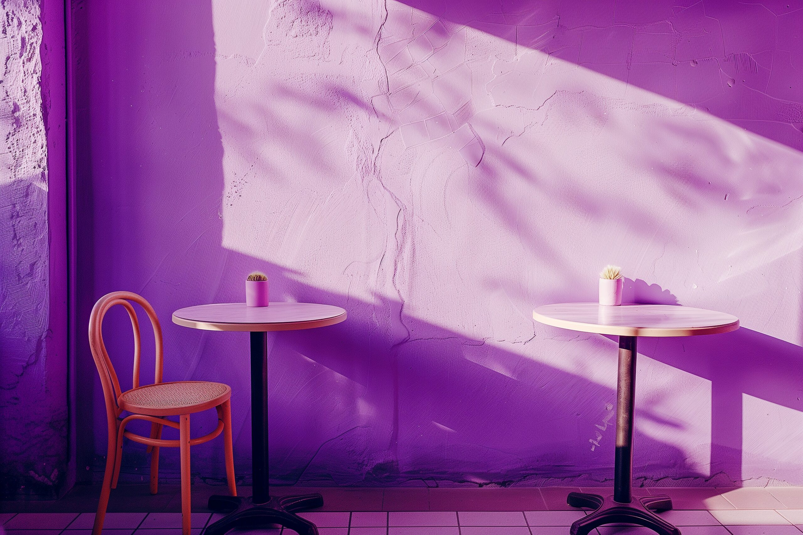 検索タグ:カフェ、インテリア、cafe、interior、店内、飲食店、オシャレ、お洒落、おしゃれ、室内、屋内、内装、内観、フリー素材、フリー画像、AI生成画像、木のテーブル、シンプル、コピースペース、パープル、purple、紫、紫色、レトロ感