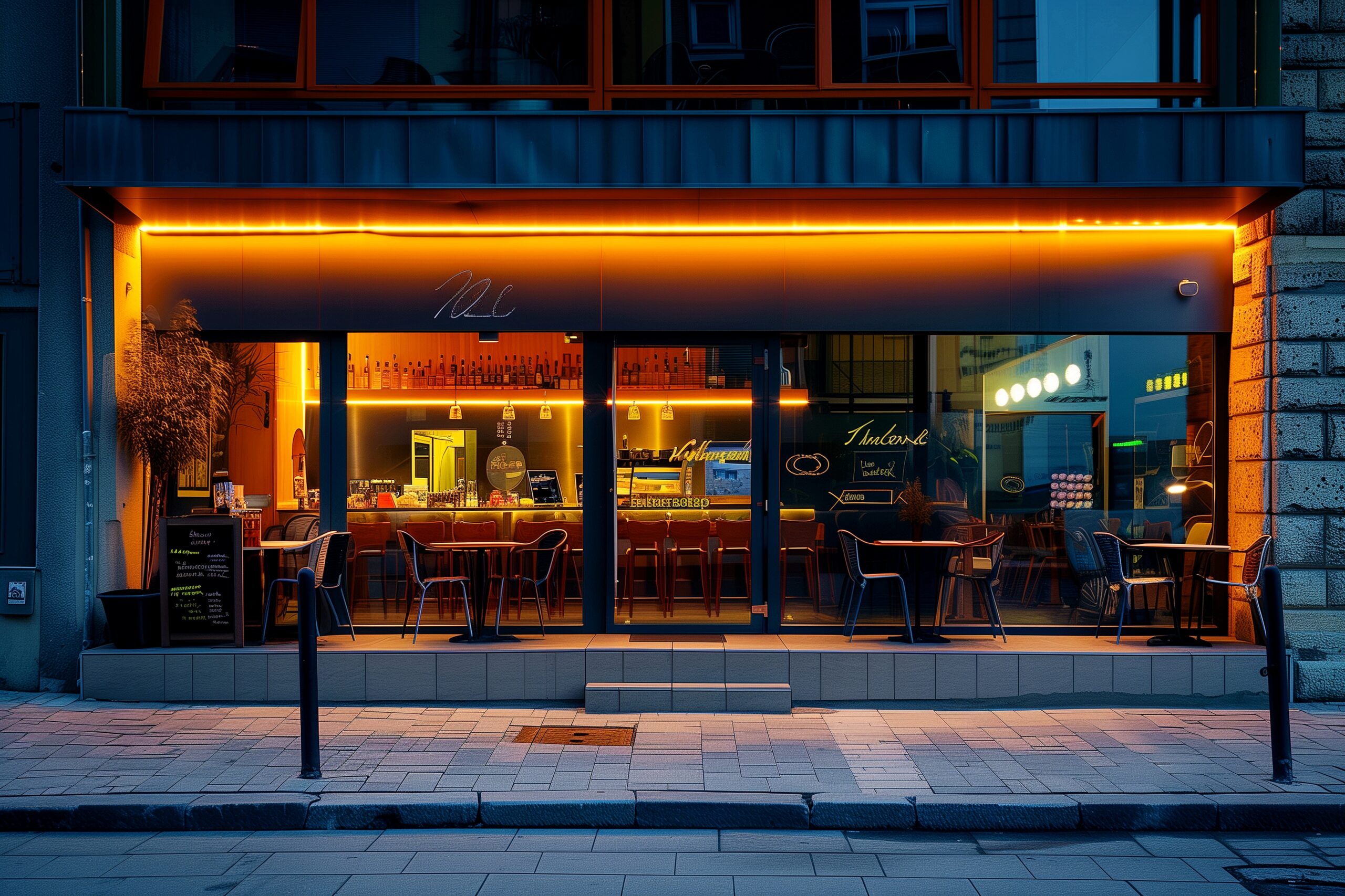 検索タグ:カフェ、cafe、飲食店、オシャレ、お洒落、おしゃれ、外観、建物、建築、お店、店舗、フリー素材、フリー画像、AI生成画像、ライトアップ、夜、光