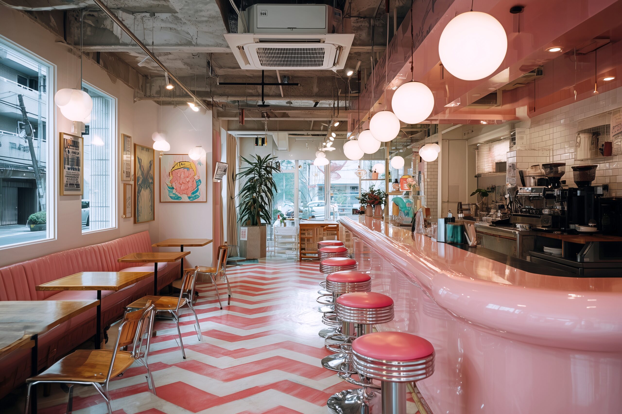 検索タグ:カフェ、cafe、飲食店、オシャレ、お洒落、おしゃれ、建物、建築、お店、店舗、フリー素材、フリー画像、AI生成画像、レトロ、昭和レトロ、懐かしい雰囲気、ボロい、古い、喫茶店、インテリア、内装、内観、ピンク