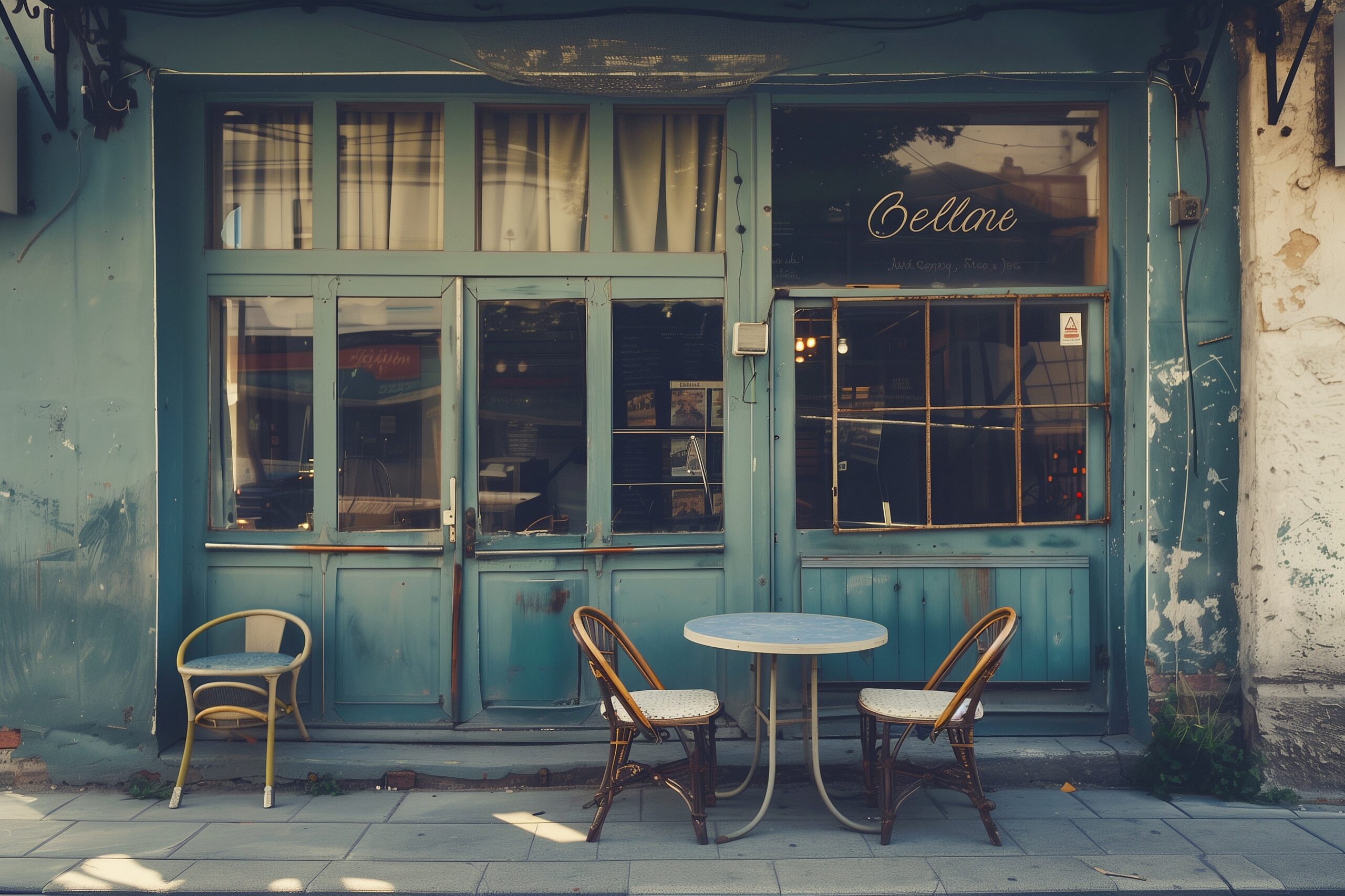 検索タグ:カフェ、cafe、飲食店、オシャレ、お洒落、おしゃれ、外観、建物、建築、お店、店舗、フリー素材、フリー画像、AI生成画像、レトロ感、昭和レトロ、廃墟、昔、サビ、錆、錆びた、サビた、廃れた