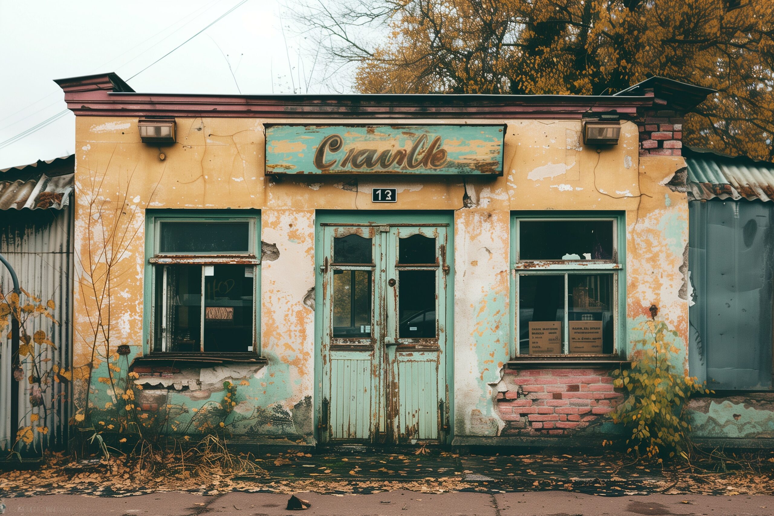 検索タグ:カフェ、cafe、飲食店、オシャレ、お洒落、おしゃれ、外観、建物、建築、お店、店舗、フリー素材、フリー画像、AI生成画像、レトロ感、昭和レトロ、廃墟、昔、サビ、錆、錆びた、サビた、廃れた