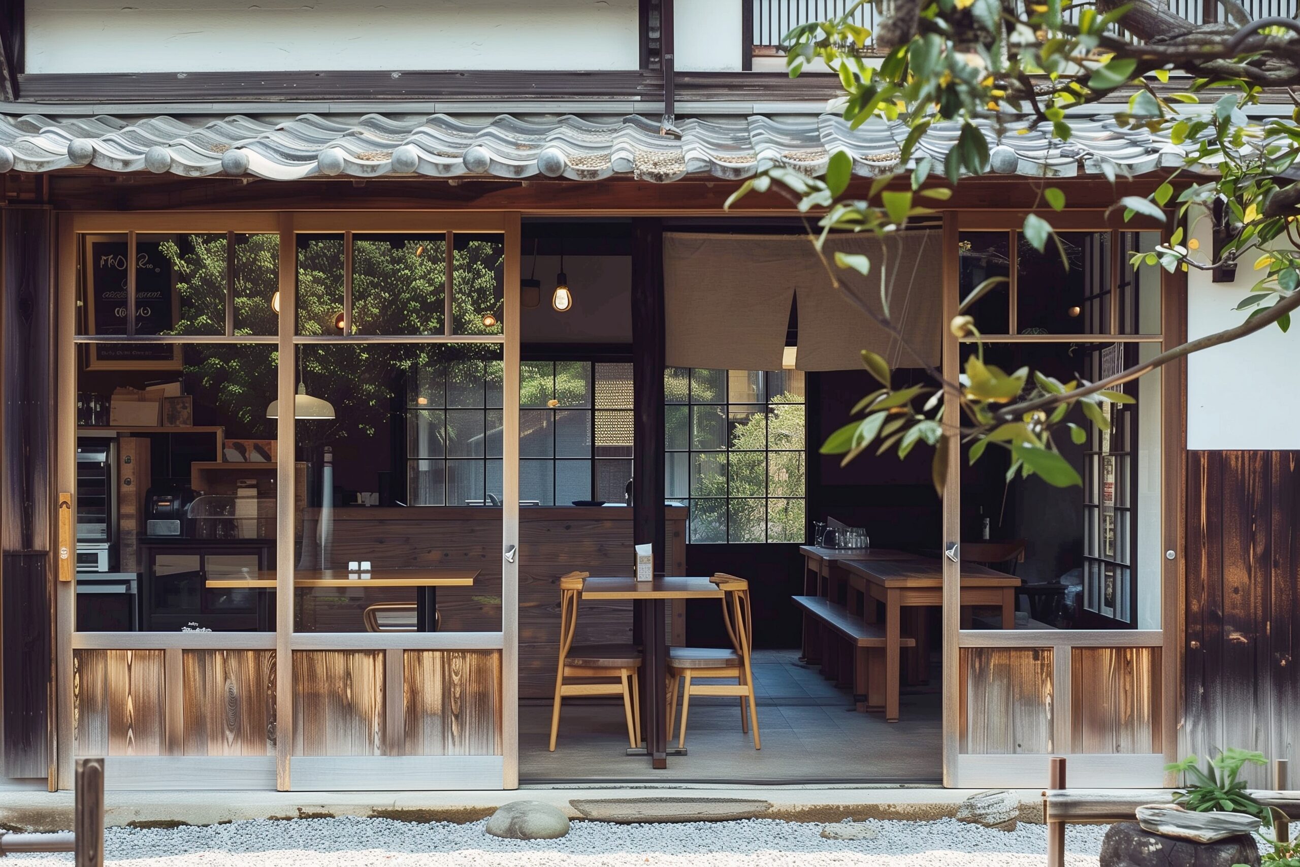 検索タグ:カフェ、cafe、飲食店、オシャレ、お洒落、おしゃれ、外観、建物、建築、お店、店舗、フリー素材、フリー画像、AI生成画像、レトロ感、昭和レトロ、古民家カフェ、古い建物