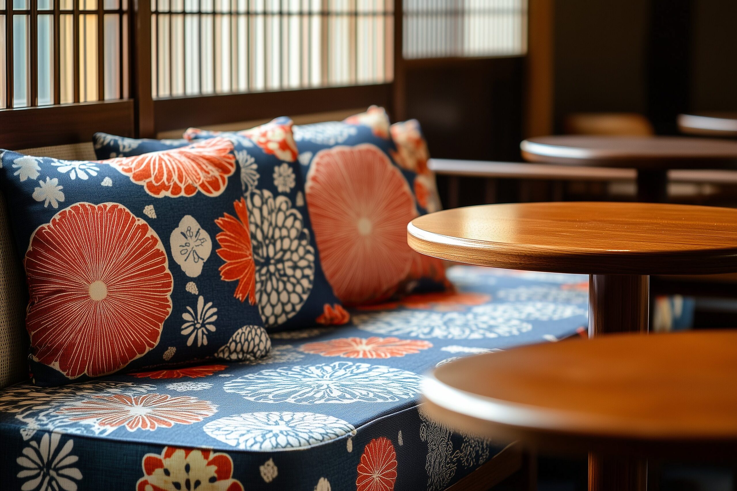 検索タグ:カフェ、インテリア、cafe、interior、店内、飲食店、オシャレ、お洒落、おしゃれ、フリー素材、フリー画像、AI生成画像、内装、内観、室内、店舗、お店、モダン、壁紙、ZOOM背景、配信用、背景素材、アイキャッチ、サムネイル、喫茶店、レトロ、小洒落た、和風、和柄、クッション、ソファ席、cushion、japanese、patterns、和、レトロ感