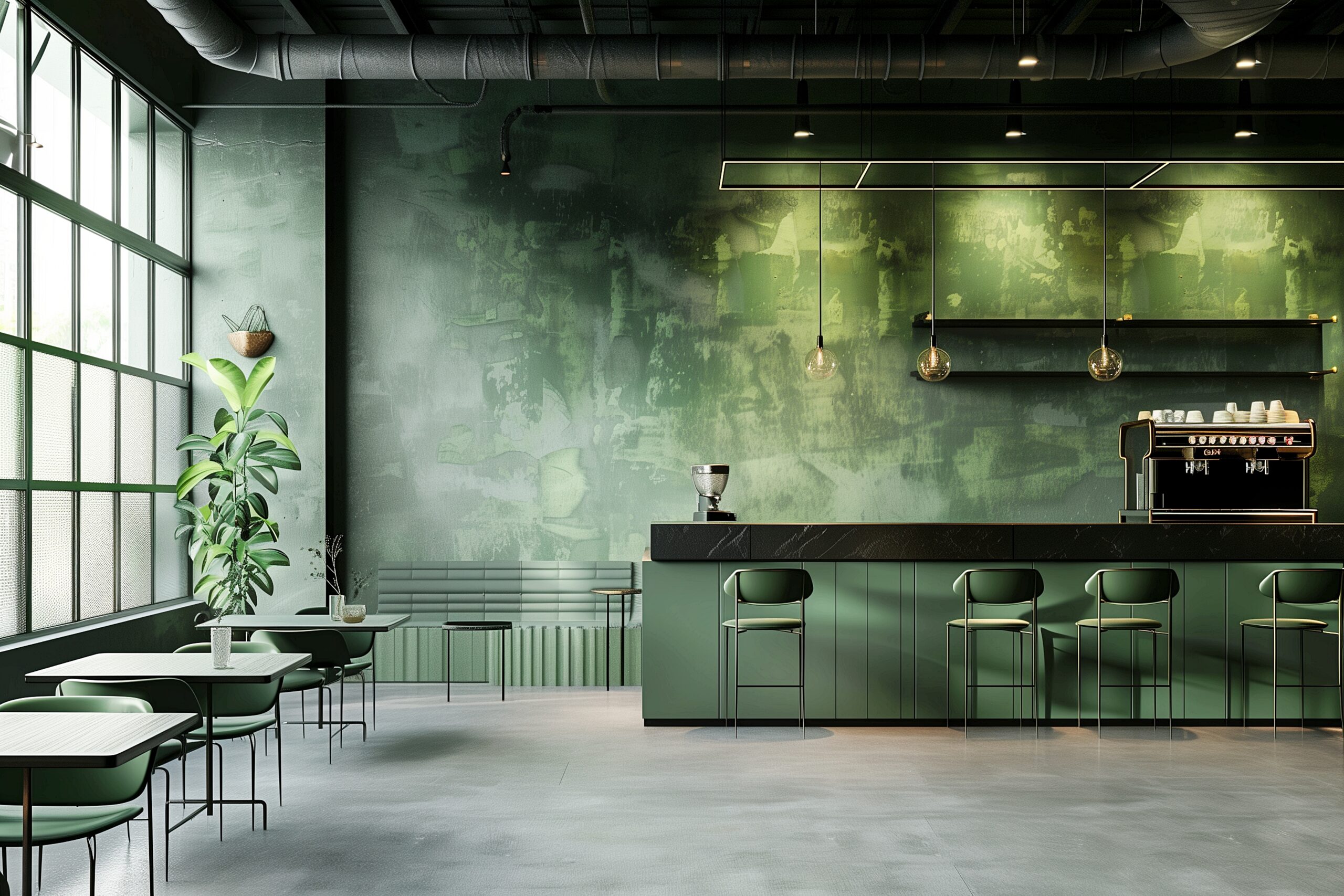 検索タグ:カフェ、インテリア、cafe、interior、店内、飲食店、オシャレ、お洒落、おしゃれ、室内、屋内、内装、内観、フリー素材、フリー画像、AI生成画像、木のテーブル、シンプル、コピースペース、モダン、落ち着いた雰囲気、和風、緑、黒、和、和室、日本
