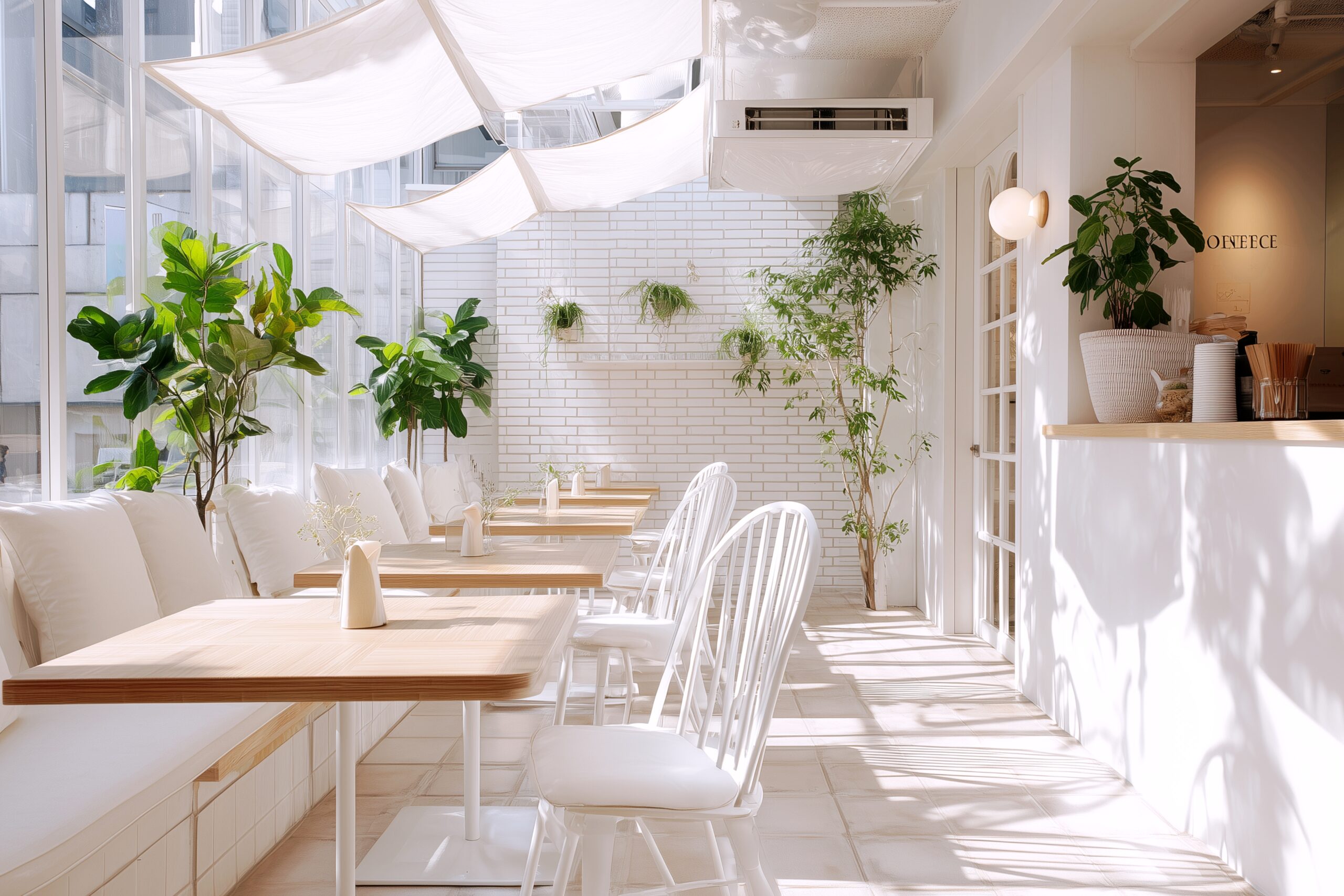 検索タグ:カフェ、インテリア、cafe、interior、店内、飲食店、オシャレ、お洒落、おしゃれ、フリー素材、フリー画像、、free、image、materials、AI生成画像、内装、内観、室内、店舗、お店、モダン、壁紙、ZOOM背景、配信用、背景素材、アイキャッチ、サムネイル、喫茶店、雰囲気、涼しい、夏、サマー、白い、白、ホワイト、涼しい雰囲気、南国、爽やか、さわやか、開放的
