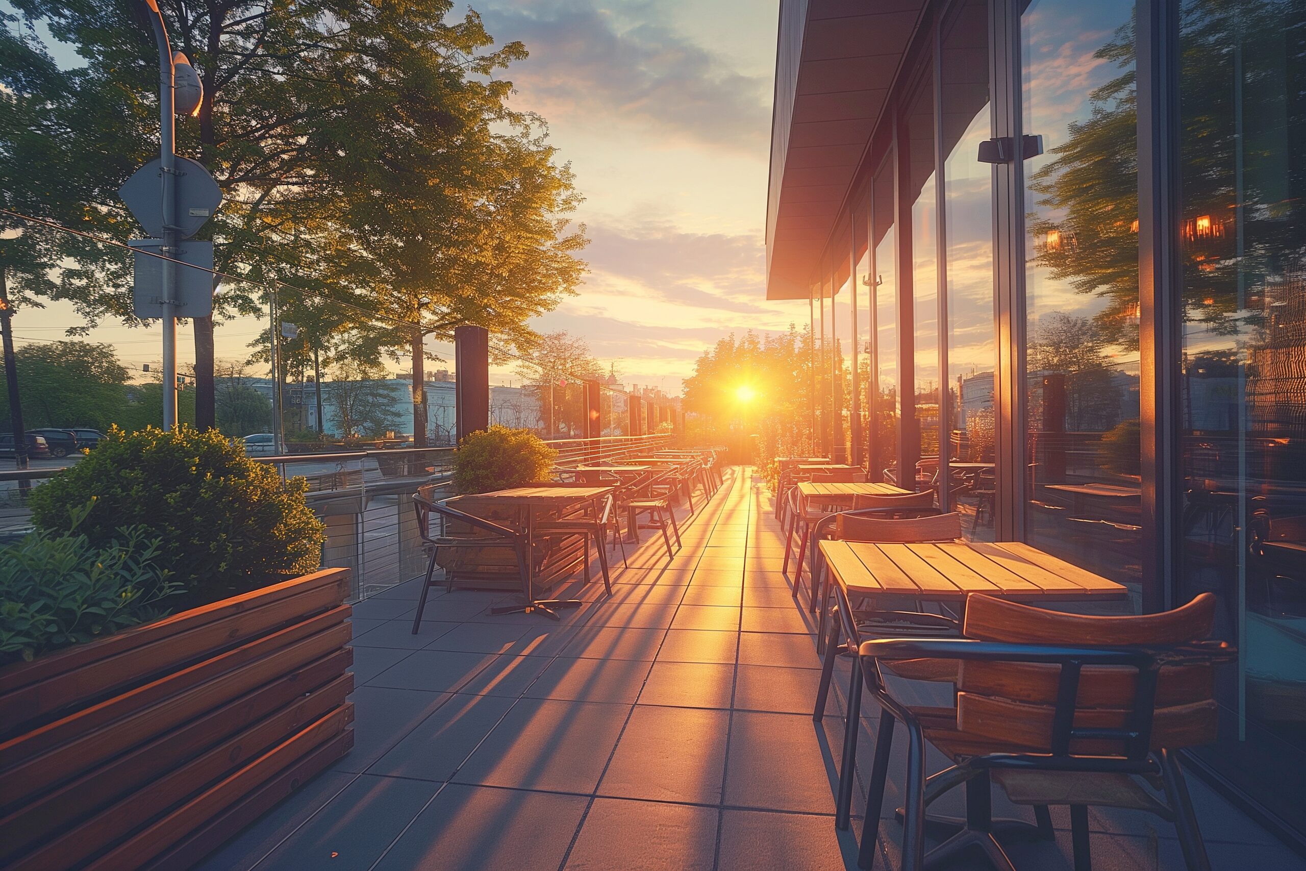 検索タグ:カフェ、cafe、飲食店、オシャレ、お洒落、おしゃれ、木のテーブル、フリー素材、フリー画像、AI生成画像、レストラン、カフェテラス、外、アウトドア、夕日、夕暮れ、夕方、夕焼け、太陽光、眩しい、逆光、綺麗、きれい、キレイ