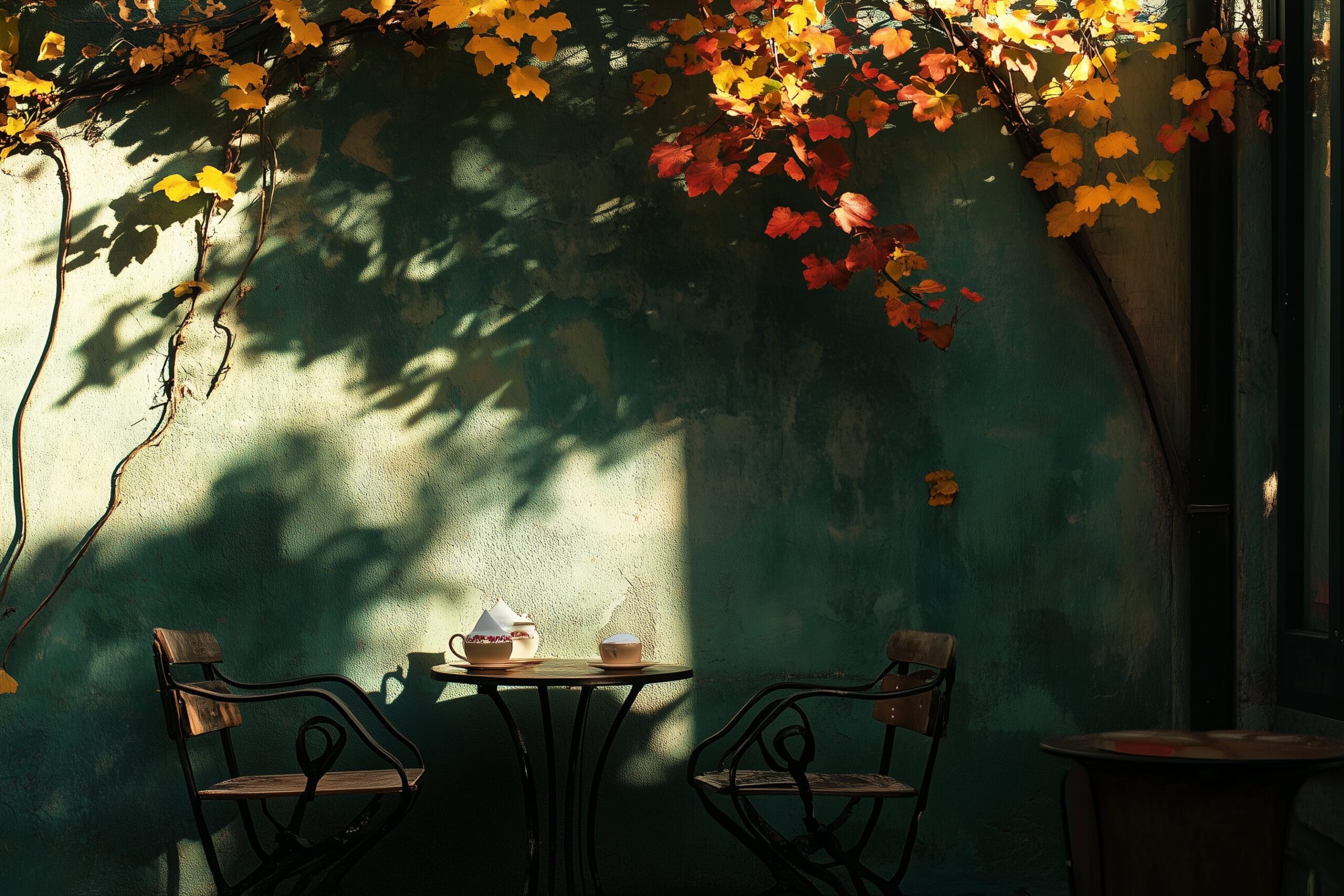 検索タグ:カフェ、cafe、オシャレ、お洒落、おしゃれ、フリー素材、フリー画像、AI生成画像、コピースペース、背景、アイキャッチ、カフェテラス、テラス、自然、雰囲気、アウトドア、terrace、秋、Autumn、季節、四季、freeimage