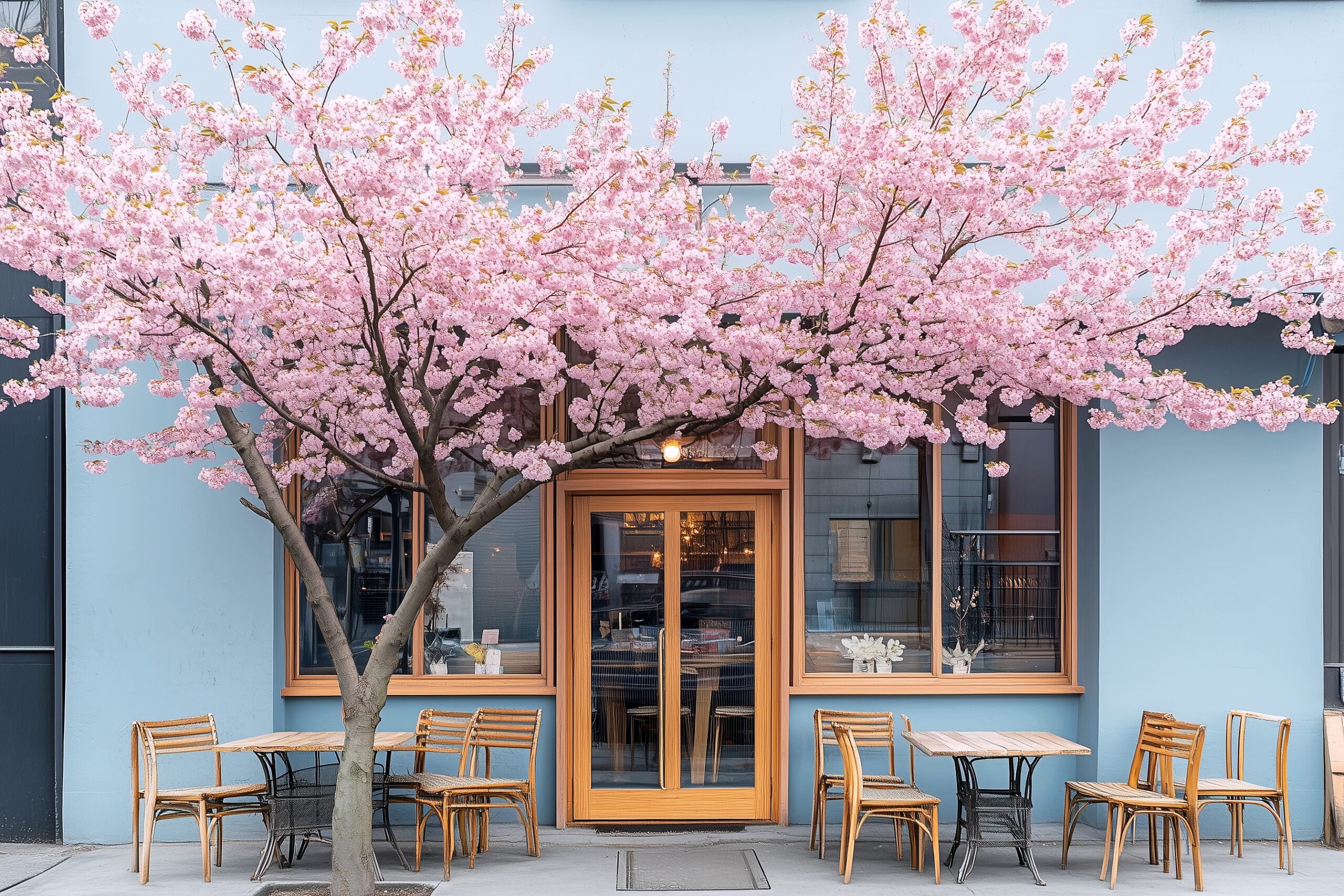 検索タグ:カフェ、cafe、飲食店、オシャレ、お洒落、おしゃれ、外観、建物、建築、お店、店舗、フリー素材、フリー画像、AI生成画像、モダン、飲食店、店、free、materials、image、shop、古民家、古い建物、レトロ、rétro、モダン、外装、桜、さくら、サクラ、春、Spring、SAKURA