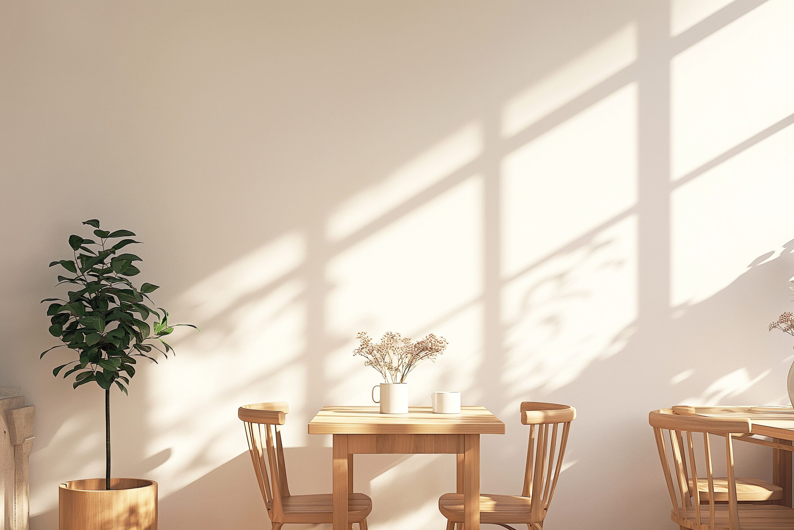 検索タグ:カフェ、インテリア、cafe、interior、店内、飲食店、オシャレ、お洒落、おしゃれ、室内、屋内、内装、内観、フリー素材、フリー画像、AI生成画像、木のテーブル、シンプル、コピースペース