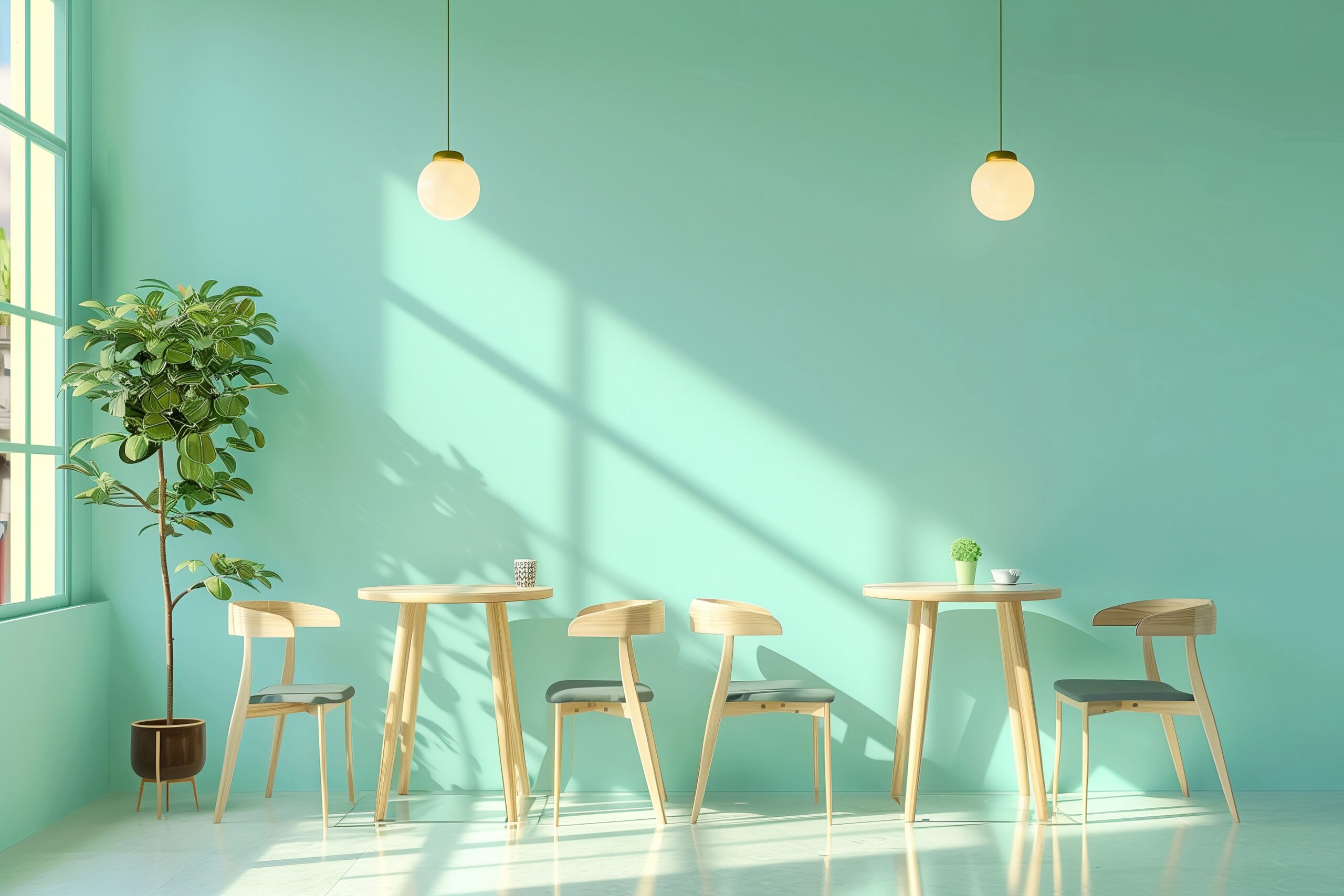 検索タグ:カフェ、インテリア、cafe、interior、店内、飲食店、オシャレ、お洒落、おしゃれ、室内、屋内、内装、内観、フリー素材、フリー画像、AI生成画像、木のテーブル、シンプル、コピースペース、観葉植物
