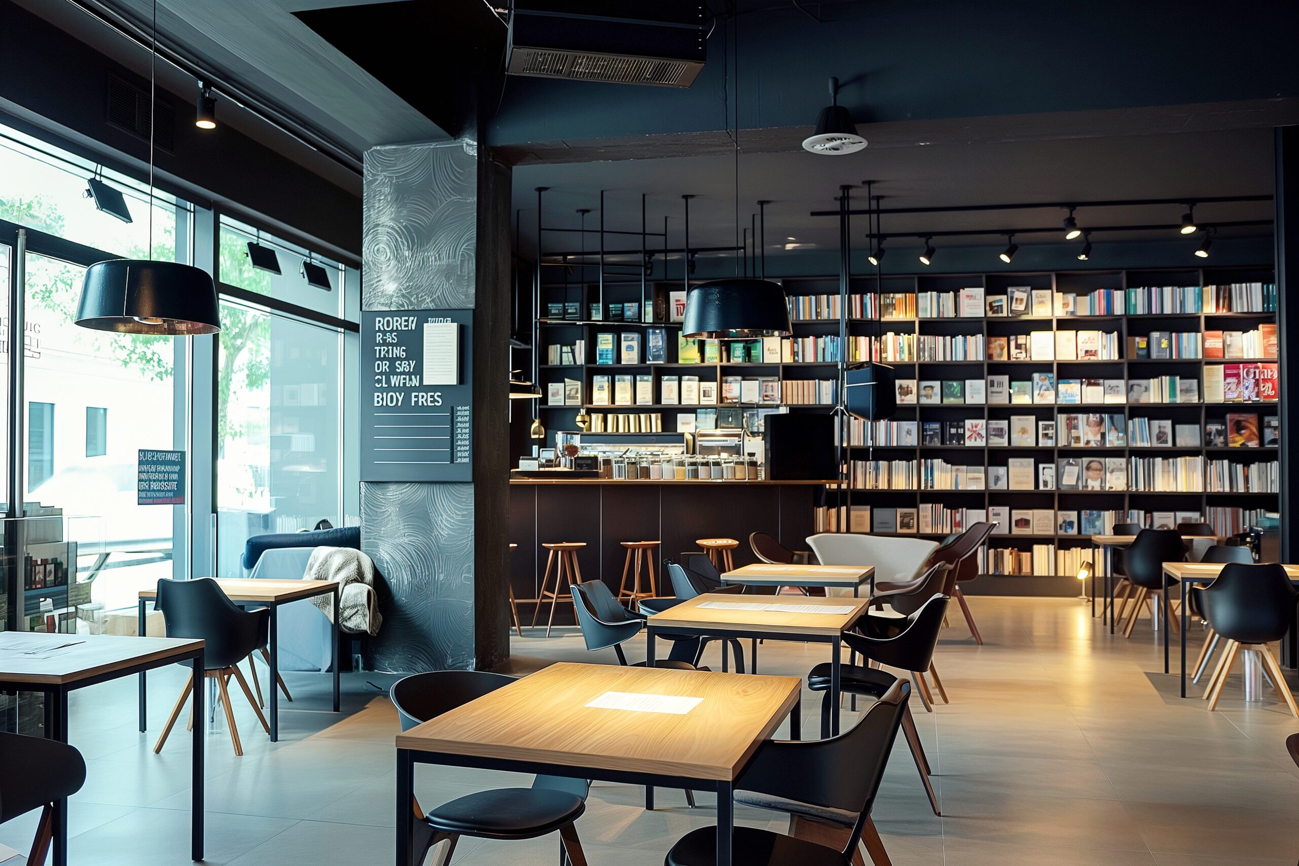 検索タグ:カフェ、インテリア、cafe、interior、店内、飲食店、オシャレ、お洒落、おしゃれ、ブックカフェ、本棚、フリー素材、フリー画像、AI生成画像、内装、内観、室内、店舗、お店、読書、図書館、Book、モダン、壁紙、ZOOM背景、配信用、背景素材、アイキャッチ、サムネイル