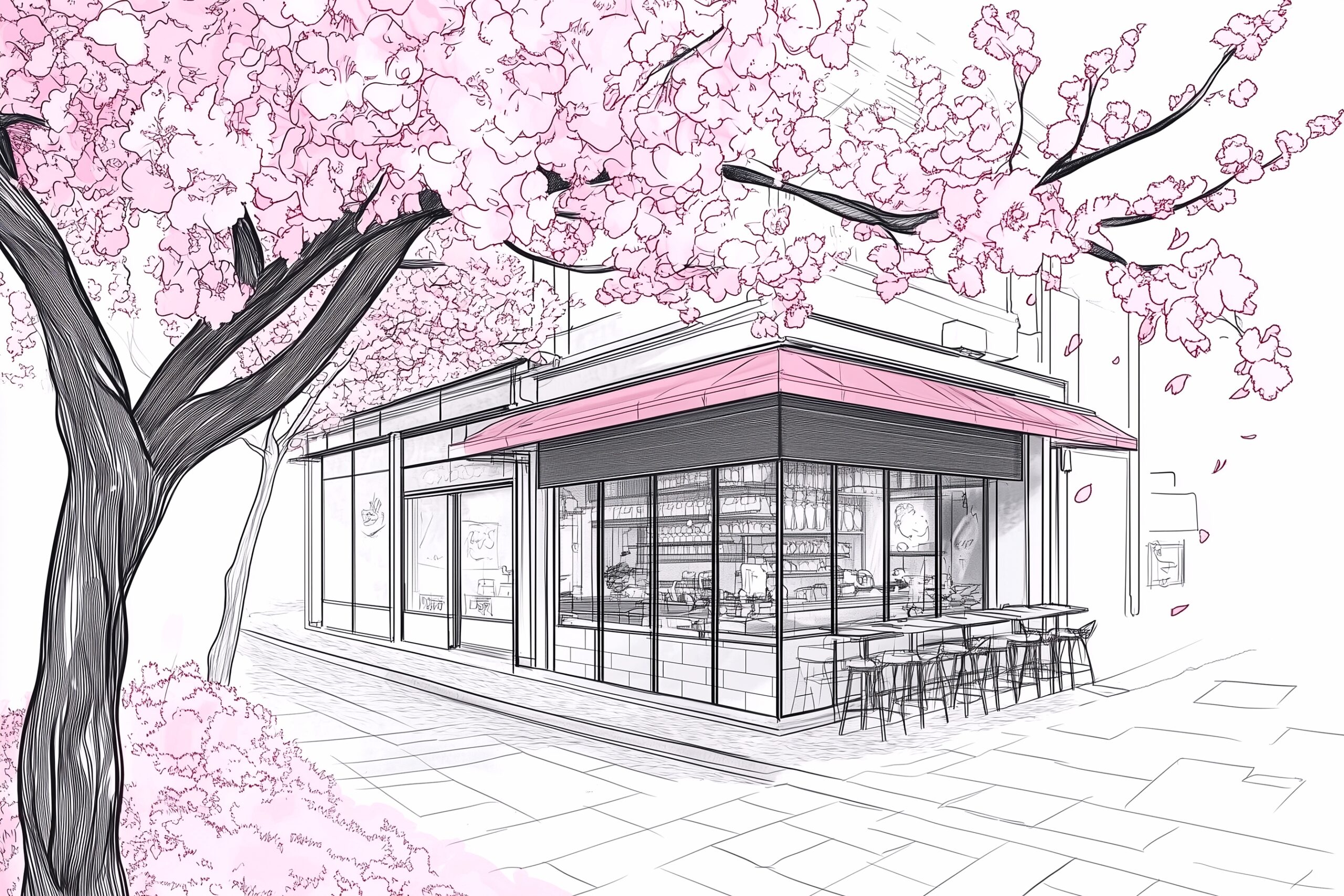 検索タグ:カフェ、cafe、飲食店、オシャレ、お洒落、おしゃれ、外観、建物、建築、お店、店舗、フリー素材、フリー画像、AI生成画像、モダン、飲食店、店、free、materials、image、shop、古民家、古い建物、レトロ、rétro、モダン、外装、桜、さくら、サクラ、春、Spring、SAKURA