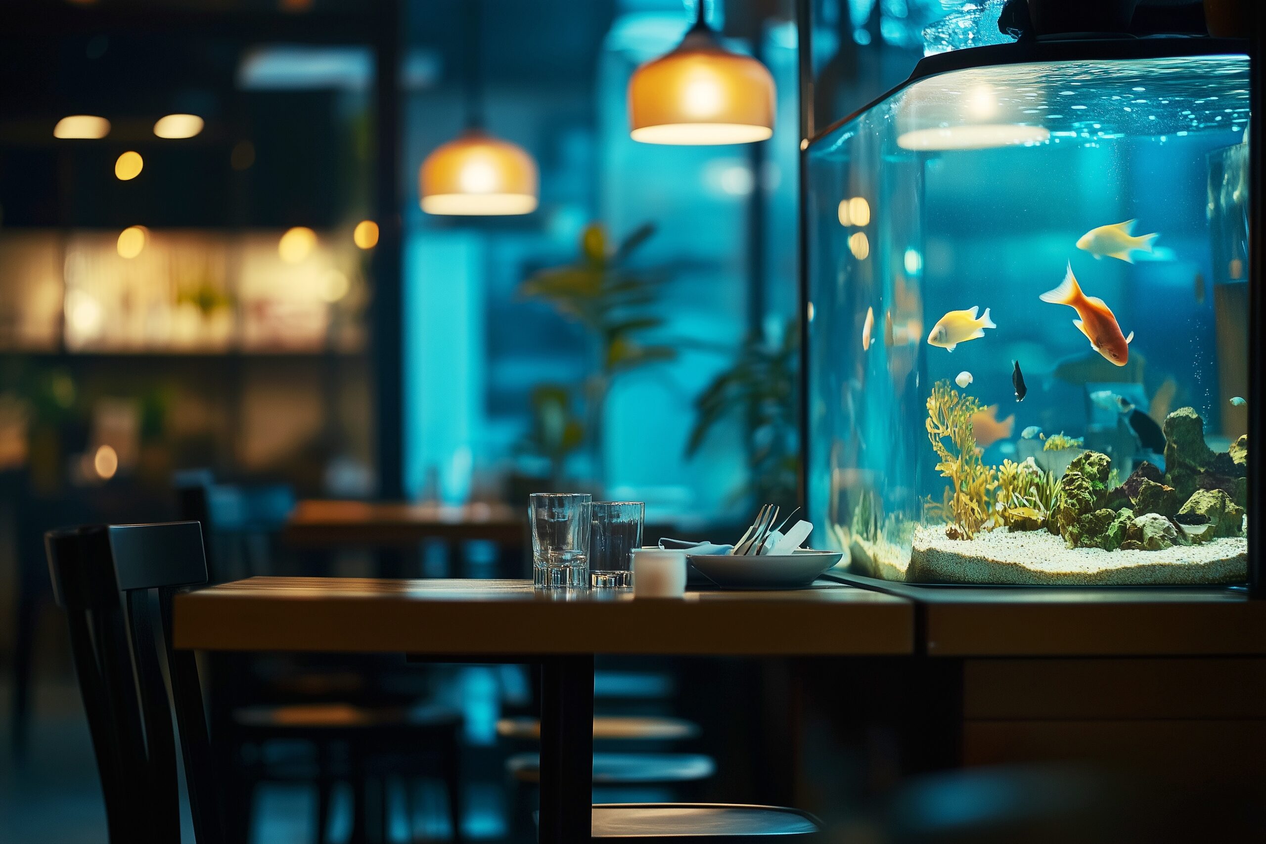 検索タグ:カフェ、インテリア、cafe、interior、店内、飲食店、オシャレ、お洒落、おしゃれ、フリー素材、フリー画像、、free、image、materials、AI生成画像、内装、内観、室内、店舗、お店、モダン、壁紙、ZOOM背景、配信用、背景素材、アイキャッチ、サムネイル、喫茶店、レトロ、小洒落た、暗い、水槽、熱帯魚、魚、綺麗、きれい、キレイ、美しい、魚が泳ぐ、水族館カフェ