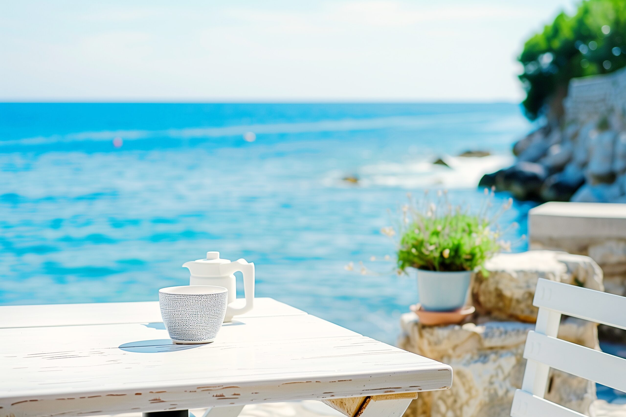 検索タグ:カフェ、cafe、飲食店、オシャレ、お洒落、おしゃれ、木のテーブル、フリー素材、フリー画像、AI生成画像、レストラン、カフェテラス、外、アウトドア、海辺、海沿い