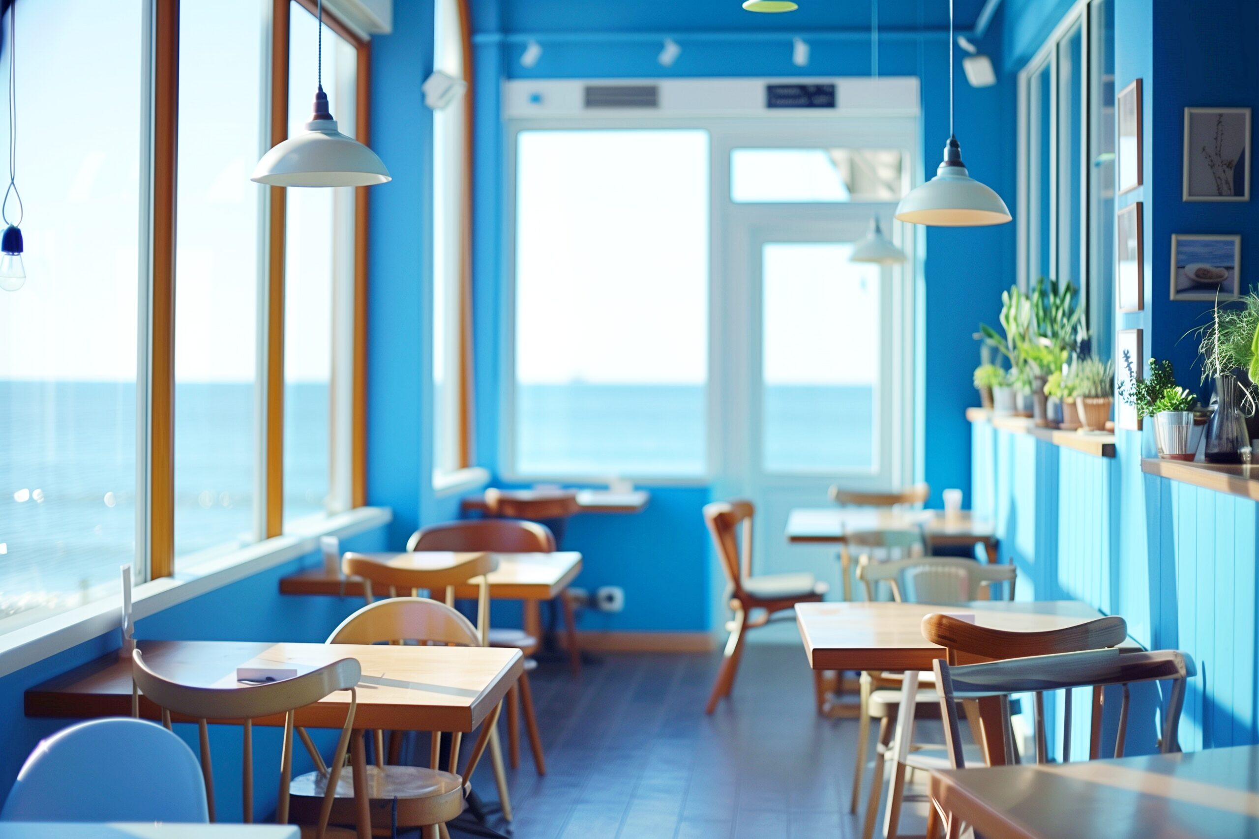 検索タグ:カフェ、インテリア、cafe、interior、店内、飲食店、オシャレ、お洒落、おしゃれ、室内、屋内、内装、内観、フリー素材、フリー画像、AI生成画像、海辺、海沿い、オーシャンビュー、海が見える、夏、リゾート地