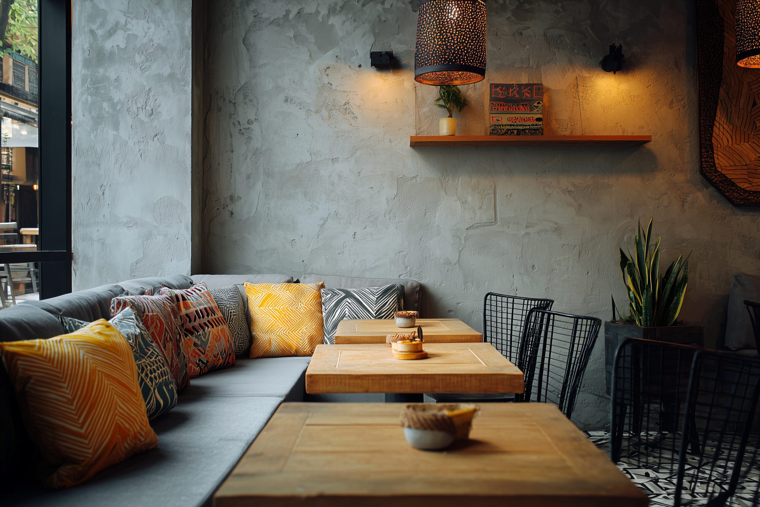 検索タグ:カフェ、インテリア、cafe、interior、店内、飲食店、オシャレ、お洒落、おしゃれ、フリー素材、フリー画像、、free、image、materials、AI生成画像、内装、内観、室内、店舗、お店、モダン、壁紙、ZOOM背景、配信用、背景素材、アイキャッチ、サムネイル、喫茶店、雰囲気、涼しい、夏、サマー、コンクリート調、観葉植物