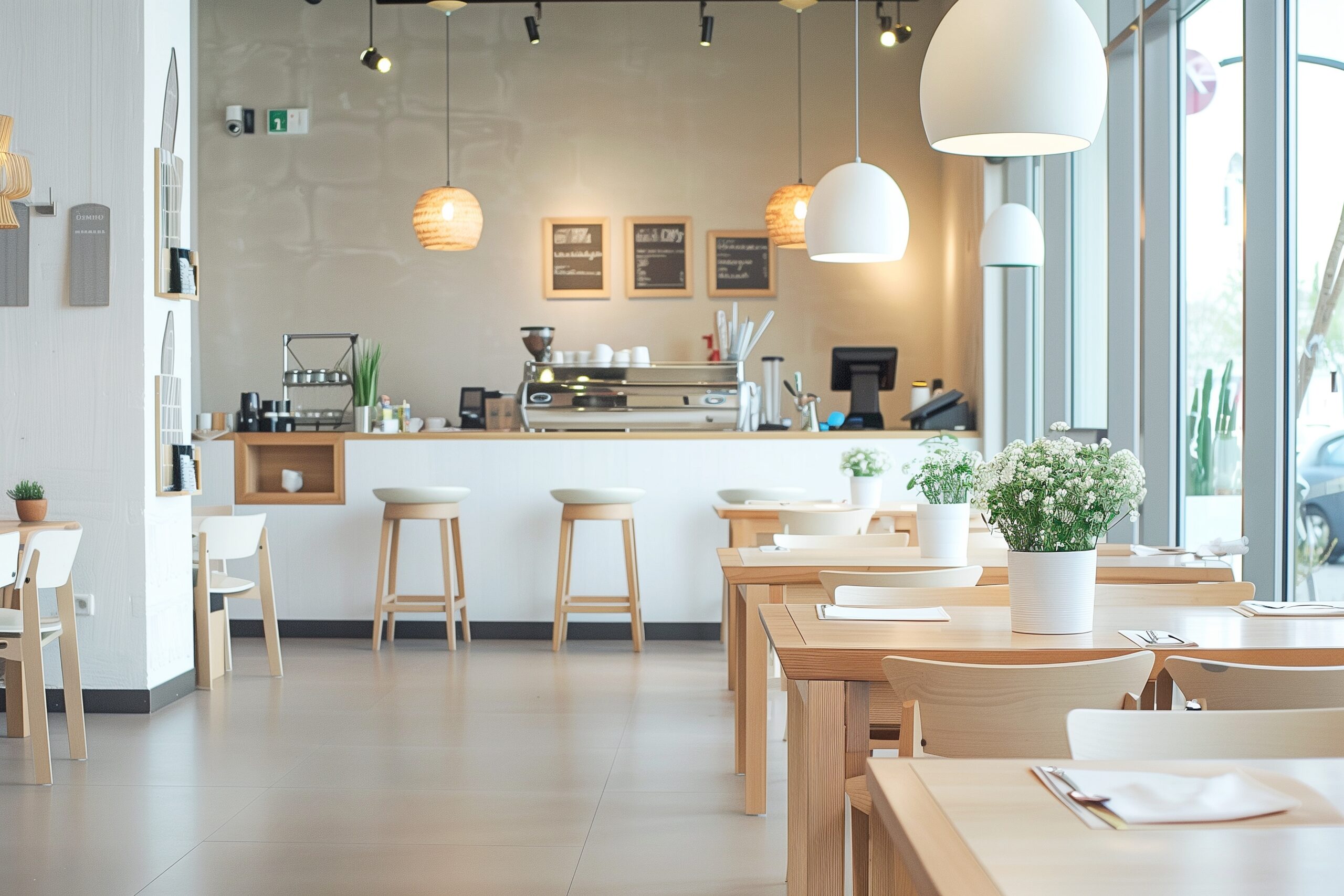 検索タグ:カフェ、インテリア、cafe、interior、店内、飲食店、オシャレ、お洒落、おしゃれ、室内、屋内、内装、内観、フリー素材、フリー画像、AI生成画像、木のテーブル、シンプル、コピースペース、モダン、白、ホワイト、清潔感、シック、落ち着いた雰囲気、綺麗、きれい、キレイ
