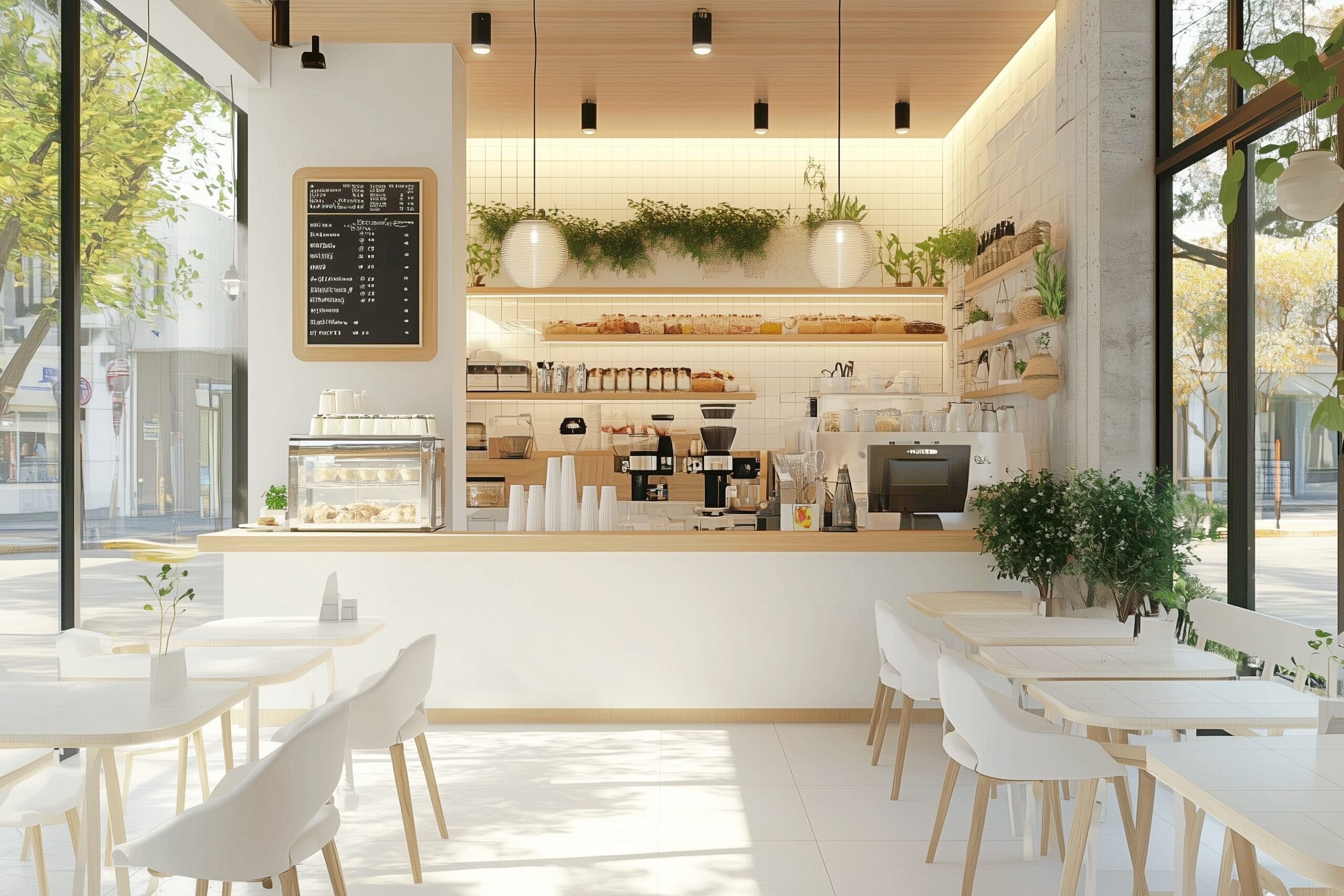 検索タグ:カフェ、インテリア、cafe、interior、店内、飲食店、オシャレ、お洒落、おしゃれ、フリー素材、フリー画像、AI生成画像、内装、内観、室内、店舗、お店、モダン、壁紙、ZOOM背景、配信用、背景素材、アイキャッチ、サムネイル、喫茶店、ナチュラル、素朴、テーブル、白、清潔感、ホワイト